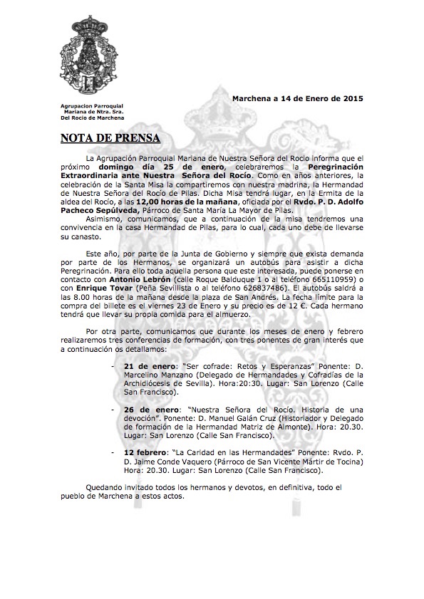 La Agrupación Parroquial Mariana de Nuestra Señora del Rocio informa que el próximo domingo día 25 de enero, celebraremos la Peregrinación Extraordinaria ante Nuestra Señora del Rocío. Como en años anteriores, la celebración de la Santa Misa la compartiremos con nuestra madrina, la Hermandad de Nuestra Señora del Rocío de Pilas. Dicha Misa tendrá lugar, en la Ermita de la aldea del Rocío, a las 12,00 horas de la mañana, oficiada por el Rvdo. P. D. Adolfo Pacheco Sepúlveda, Párroco de Santa María La Mayor de Pilas.