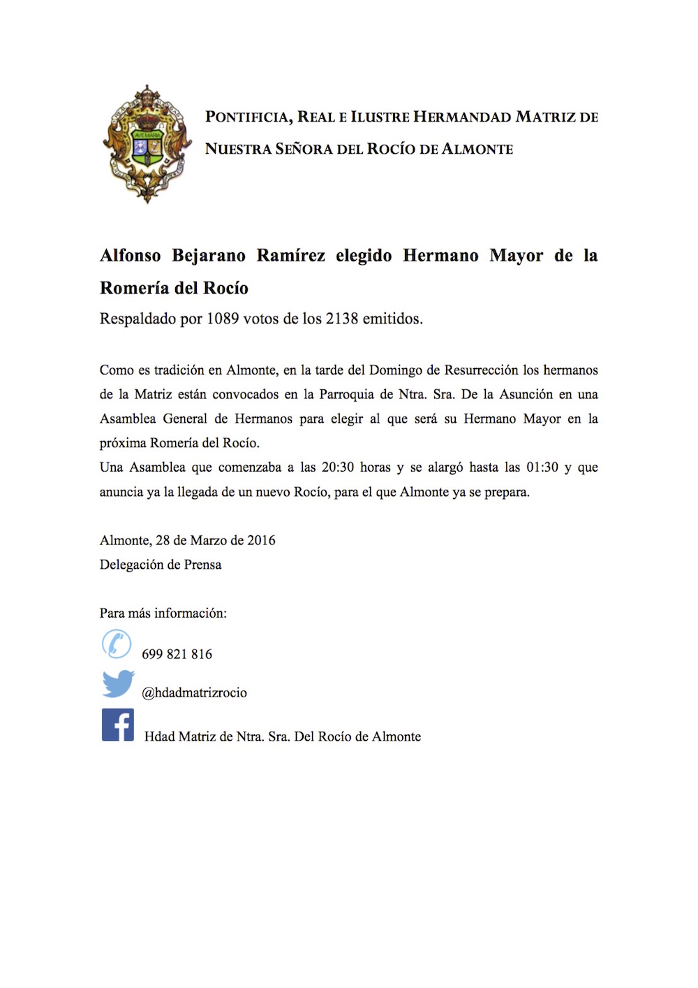 A la 1,15 de la madrugada del lunes 28 de marzo ha sido elegido, como Hermano Mayor de la Hermandad Matriz de Almonte para la Romería del 2016, Alfonso Bejarano Ramírez con el apoyo de 1089 votos, de los 2138 emitidos.