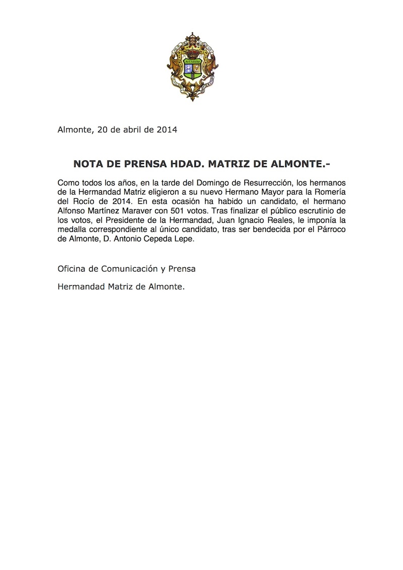 En el día de hoy, Domingo de Resurrección, Alfonso Martínez Maraver, ha sido elegido Hno. Mayor de la Hermandad Matriz, para la Romería 2014.