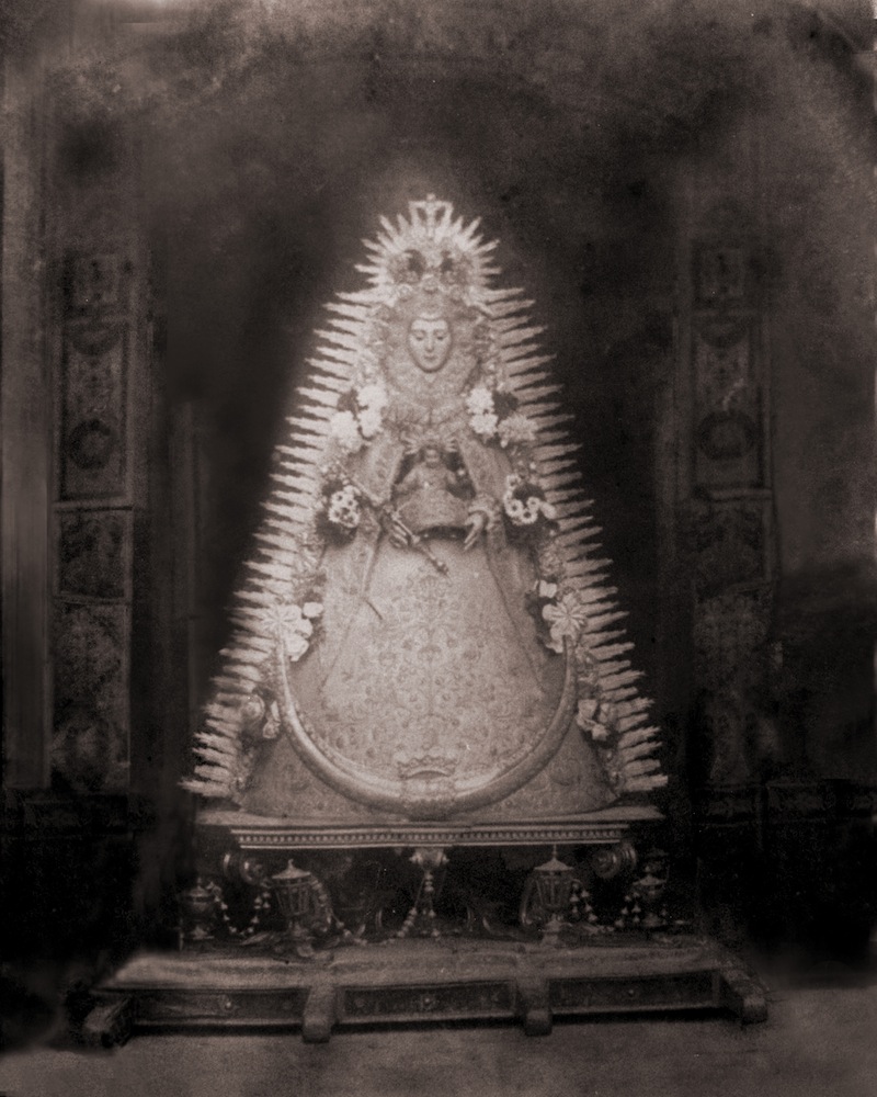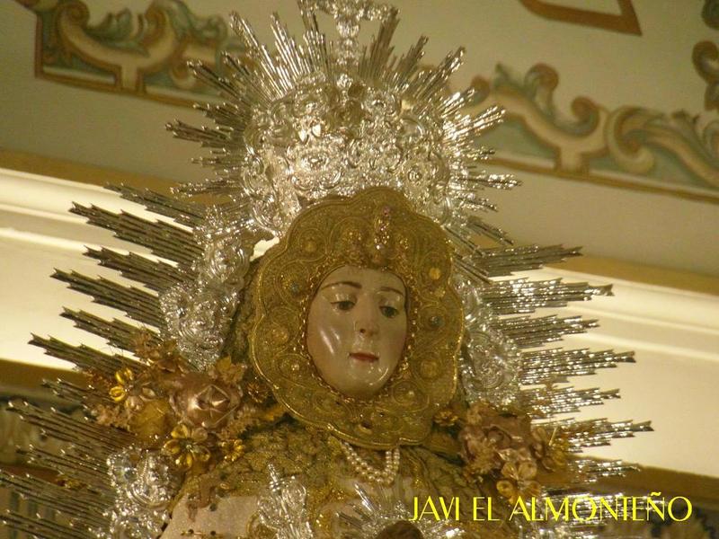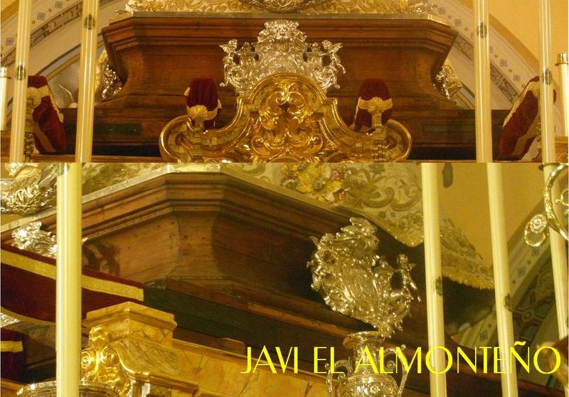 Muestra también las ráfagas de rayos viselados, de estilo imperial, a juego con la corona y media luna, de principios del Siglo XIX, que ahora han sido restauradas, en los talleres de orfebrería Villarreal, volviendo a la plata original, al habérsele retirado el baño de oro que tenían desde principios de los años ochenta.