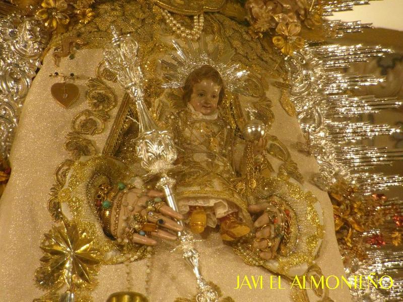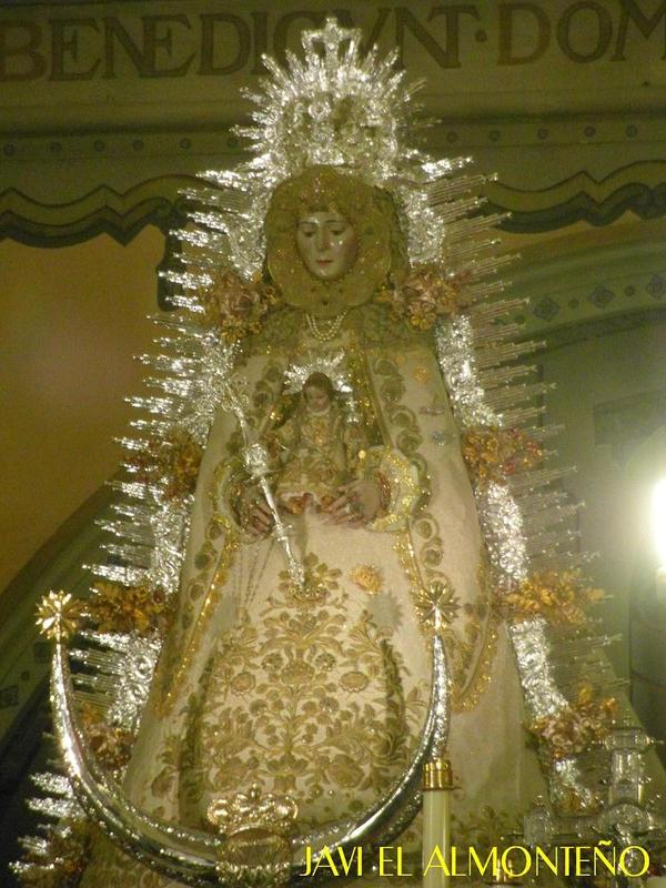 En la mañana del miércoles 24 de octubre, la Stsma. Virgen del Rocío, que se encuentra en la Iglesia Parroquial de Ntra. Sra. de la Asunción de Almonte, luce de nuevo su traje de Reina. En la pasada madrugada, las hermanas camaristas han procedido a vestirla, con el traje denominado de Montpansier, que llevara la Virgen el día de su coronación canónica, en 1919. Fue donación de la Condesa de París, Dª Isabel Francisca de Orleans y Borbón.