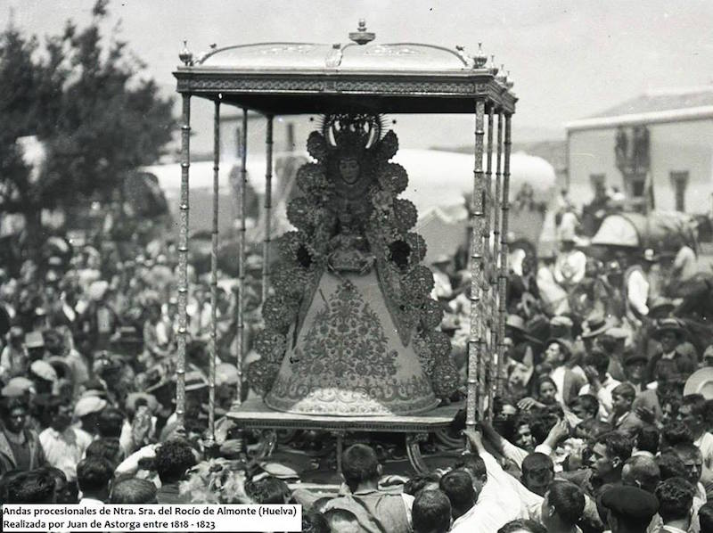 En una rendición de cuenta fechada el 10 de octubre de 1823 dice que a Don Juan de Astorga, vecino de Sevilla, se le pide hacer la hechura de unas andas para la Virgen, los costos ascendieron a diez y siete mil reales. El paso era de madera dorada con funda de terciopelo encarnado y estrellas de metal amarillo con dos Ángeles que sostienen el manto. Tenía un techo de forma de templete y una peana que la acogiese en el trascurso de tan agitada procesión. Entrelazadas mediante cadenetas florales, figuraban a sus plantas unas diminutas eolipilas, la versión en madera de aquellos recipientes de luminarias que se prodigan por entre las torres de las iglesias.