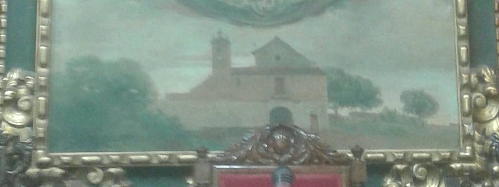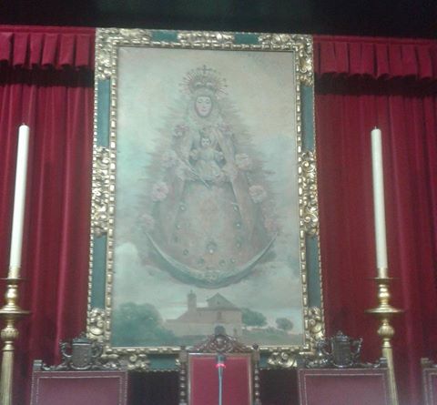 Magnífica iniciativa de la delegación de cultos y protocolo de la Hdad Matriz de utilizar el cuadro de García Rodriguez de 1917 que se encuentra habitualmente en la parroquia de Santa María Magdalena de Dos Hermanas para presidir el estrado de la Asamblea General fe Presidentes y Hnos Mayores celebrada hoy en Almonte, y que exhibe al pié de la Virgen la fachada de la antigua ermita que se reformaría aquel mismo año. Uno de los lienzos más antiguos que se conservan de la sagrada Imagen con su iconografía del siglo X I X, que se modificó en 1919.