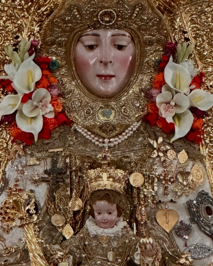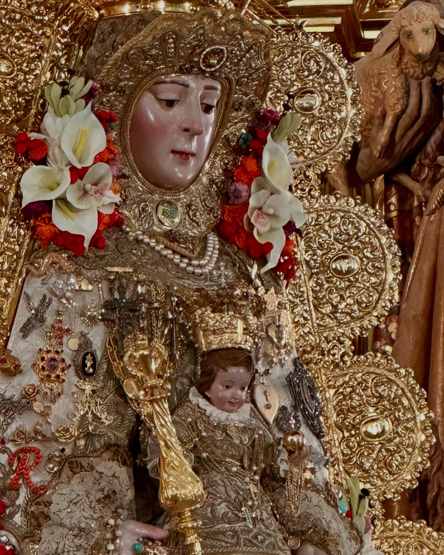 El rostro de nuestra Madre se enmarca con el rostrillo que le regaló el canónigo Muñoz y Pabón, con motivo, así mismo, de la Coronación Canónica de la Virgen.