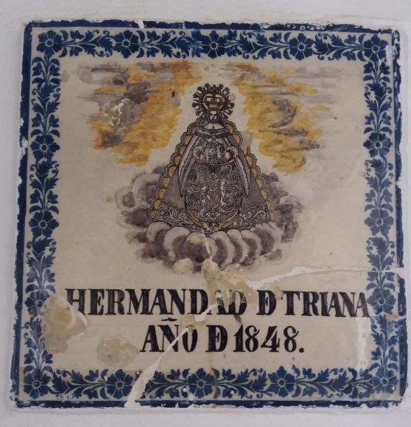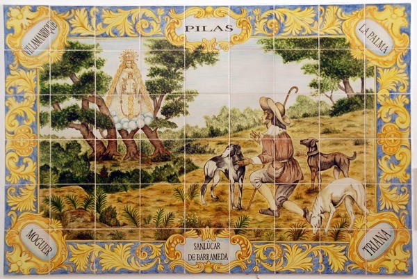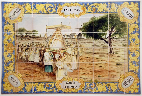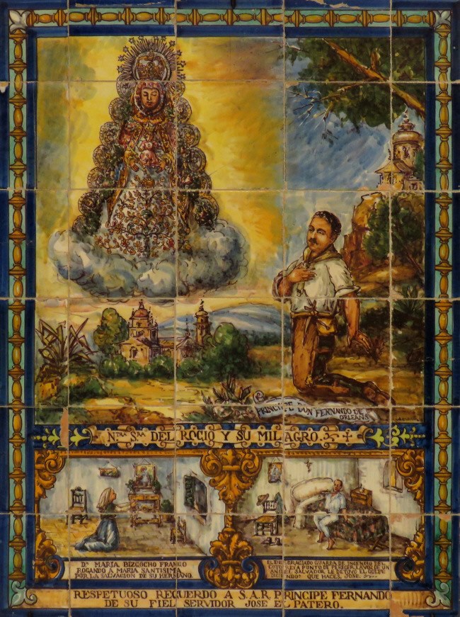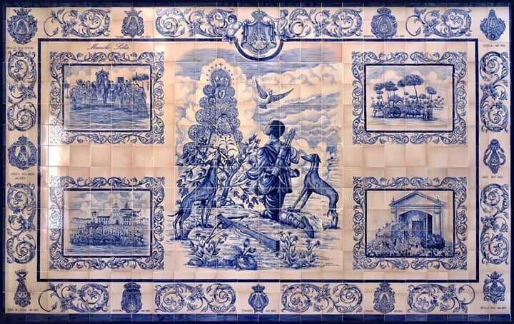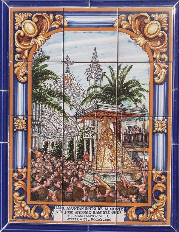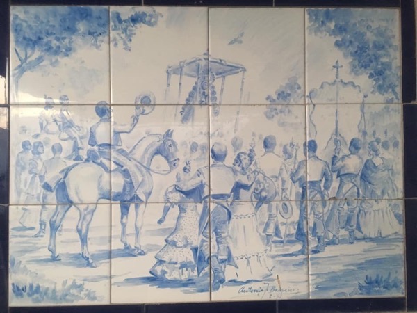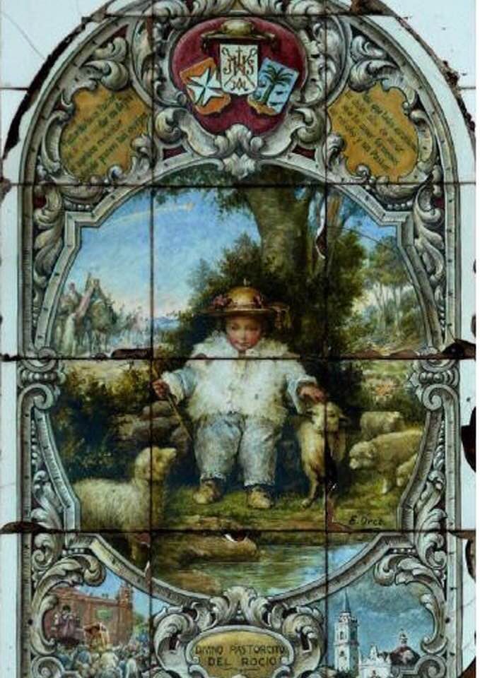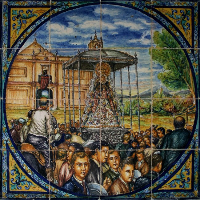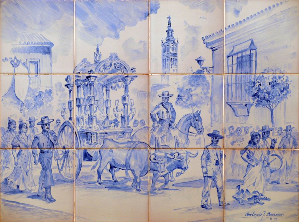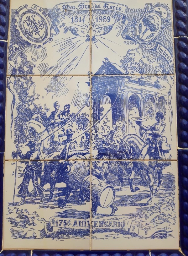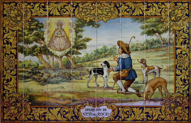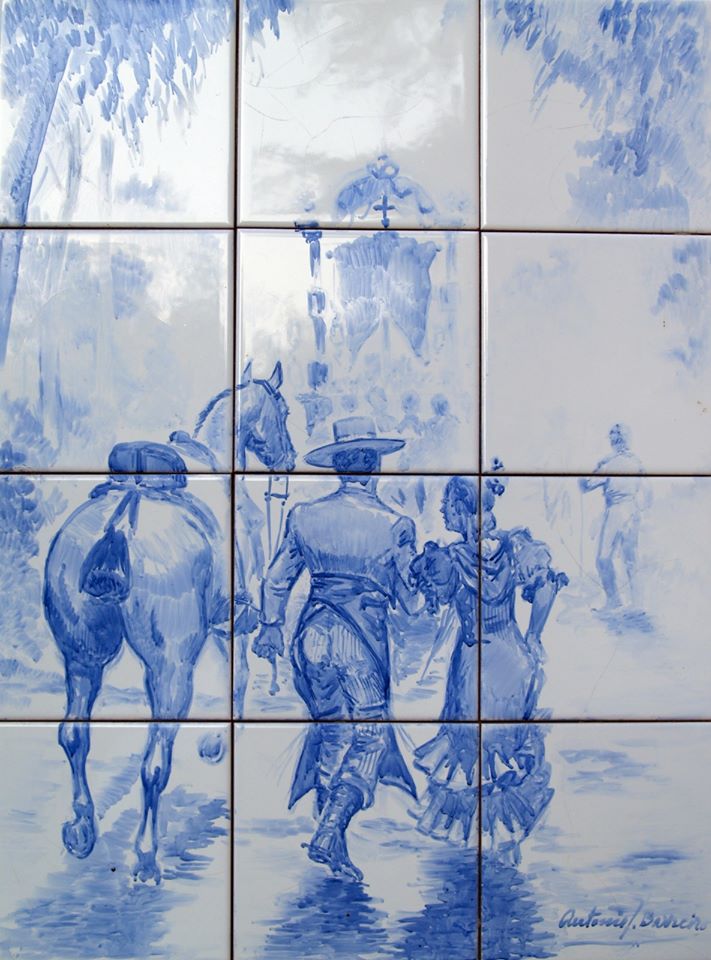 Curioso y antiguo azulejo que se encuentra en el zaguán de una casa del Patio de Banderas, próxima al Real Alcázar de Sevilla. En él se aprecia a la izquierda un trozo de la ráfaga de la Virgen del Rocío, mientras por el Real de la aldea se observa la comitiva de una Hermandad que llega, con la pareja de la Guardia Civil a caballo y los tamborileros por delante y tras ellos caballistas portando banderas y el Simpecado de la Hermandad, mientras al fondo se aprecian carretas y caballos descansando. Pedro Rodríguez Bueno
