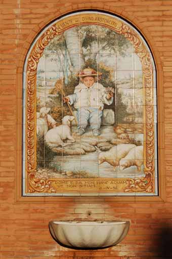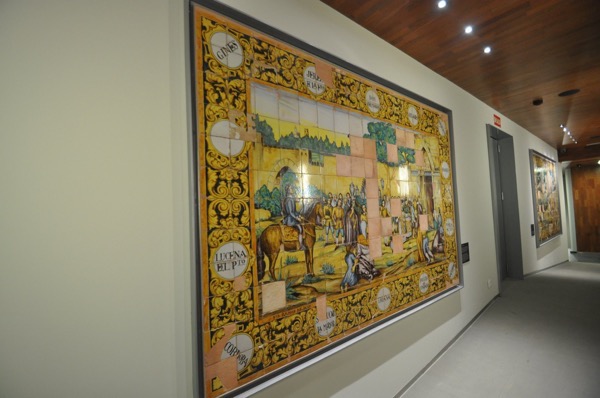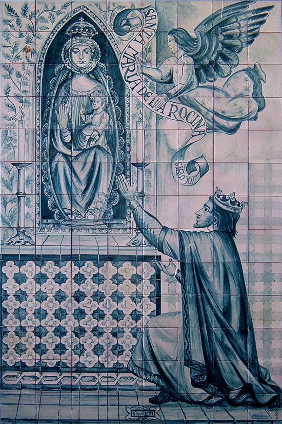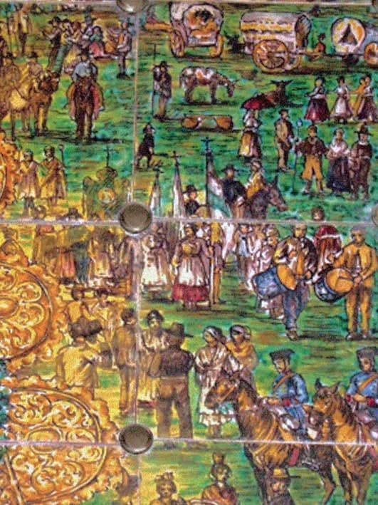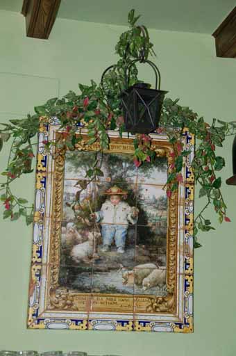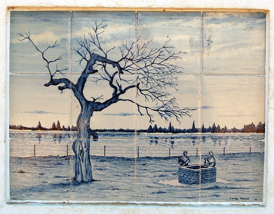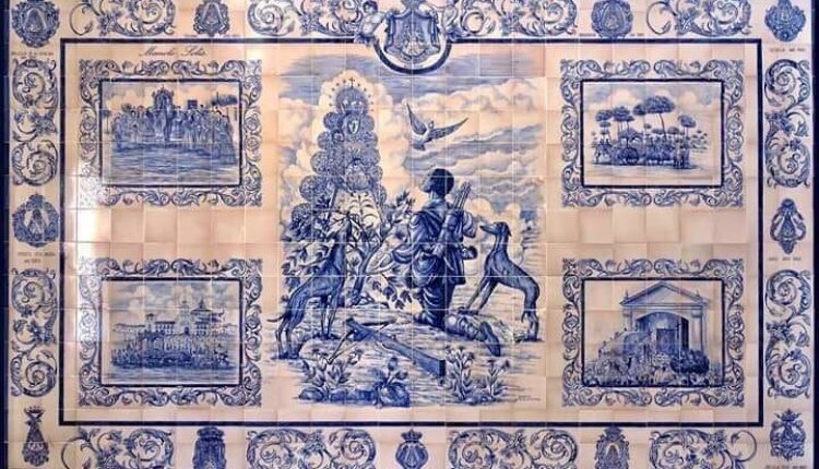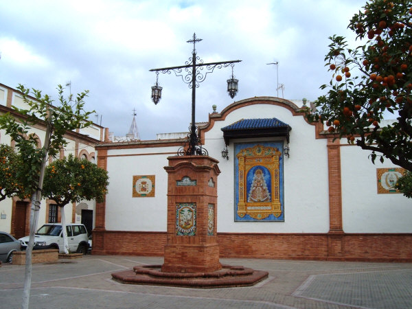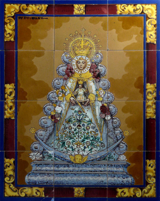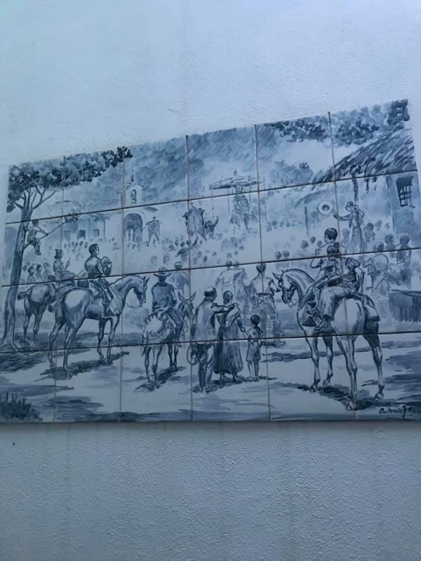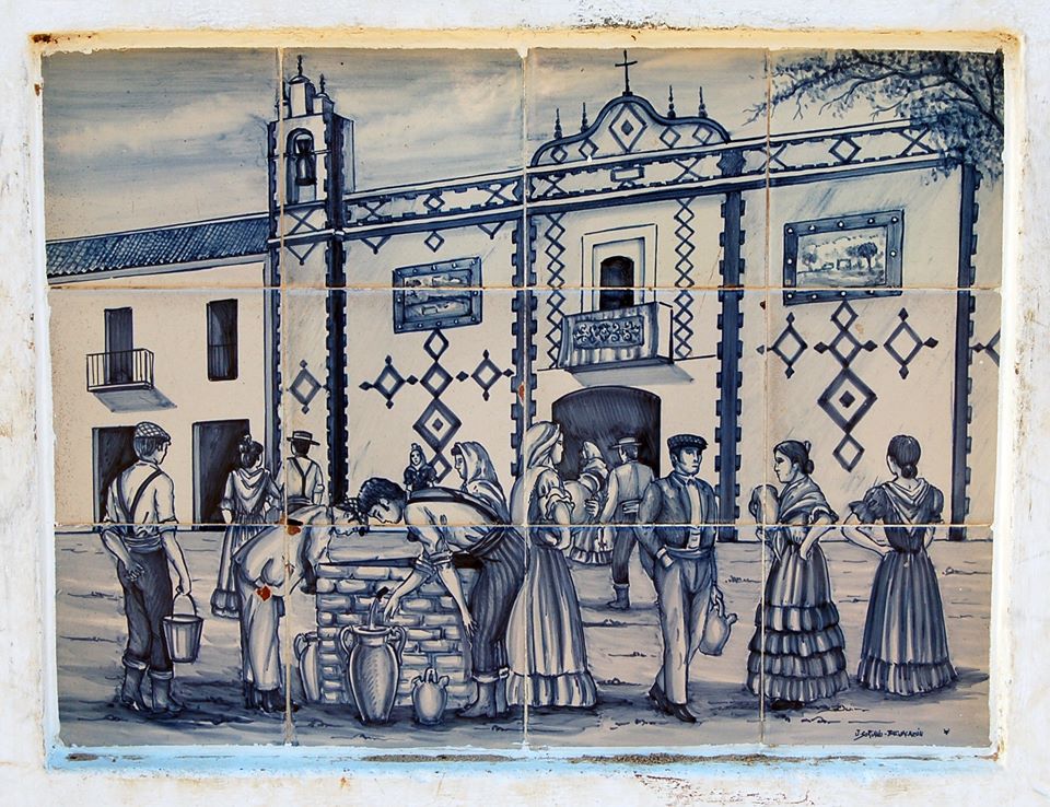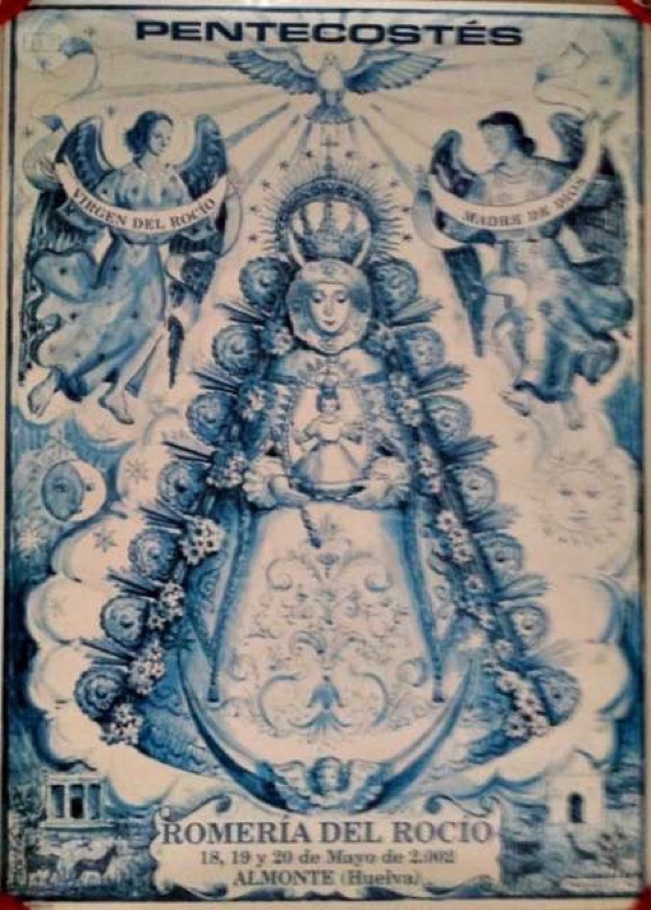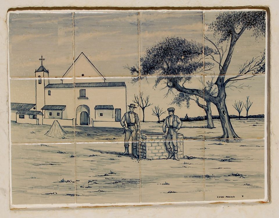 Curioso y antiguo azulejo que se encuentra en el zaguán de una casa del Patio de Banderas, próxima al Real Alcázar de Sevilla. En él se aprecia a la izquierda un trozo de la ráfaga de la Virgen del Rocío, mientras por el Real de la aldea se observa la comitiva de una Hermandad que llega, con la pareja de la Guardia Civil a caballo y los tamborileros por delante y tras ellos caballistas portando banderas y el Simpecado de la Hermandad, mientras al fondo se aprecian carretas y caballos descansando. Pedro Rodríguez Bueno