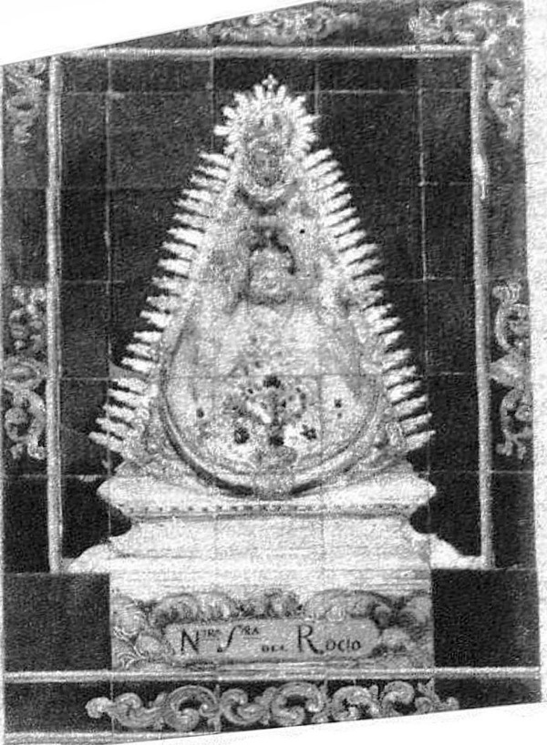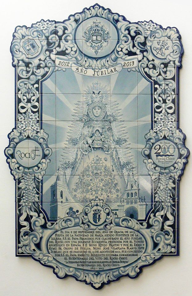 En 1919, con motivo de la Coronación Canónica de la Virgen del Rocío, se repara la fachada de la Ermita, revistiéndose de ladrillo límpio con estos azulejos. El primero de ellos, representa la leyenda del hallazgo de la Virgen por el cazador o pastor. La segunda, representa una procesión antigua de la Virgen. Alrededor de ambos azulejos, aparecen los nombres de las 12 hermandades rociares filiales que había en 1919, en grupo de 6 en cada uno. Por error, se repiten en ambos azulejos las mismas hermandades, faltando las filiales de Umbrete, Coria del Rio, Huelva, San Juan del Puerto, Benacazón y Rociada del Condado. En 1943, se alicata la fachada con azulejos de color gris claro y gris oscuro, formando rombos, los cuales permanecen hasta 1963, fecha del derribo de la Ermita. En esta ocasión, se vuelven a colocar otros dos cuadros de azulejos, con idénticos temas pero con el nombre alrededor de las 28 (14+14) Hermandades Filiales en ese año de 1943. Dichos azulejos, se pueden contemplar en la actualidad, en el pasillo que une las dos salas del Museo del Rocío en los altos del Santuario. Manuel Romero Triviño