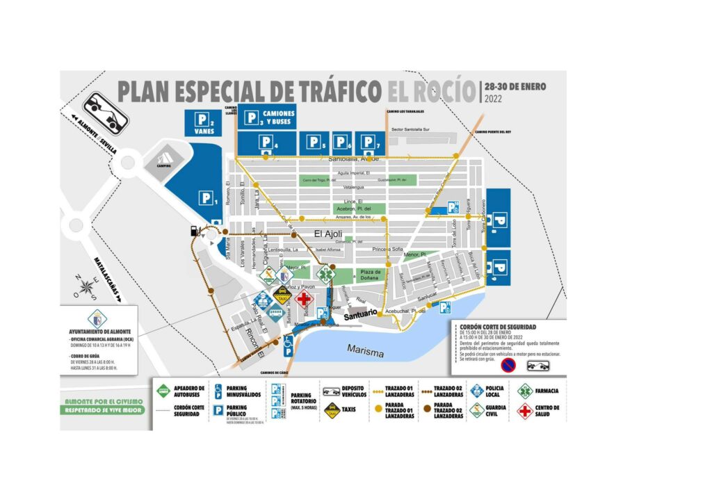 Queda Prohibida la Circulación (además del estacionamiento) desde las 12:00 horas del viernes 28 a las 16:00 horas del domingo 30 de enero de 2022 en todos los alrededores del Santuario, calle Moguer, calle La Romería, El Real. Plaza del Acebuchal y zona de corte habitual junto al Paseo Marismeño, pudiendo ser modificado a criterio de la Policía Local.