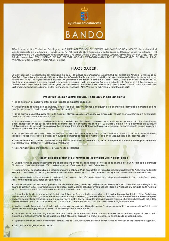 La convocatoria y organización del programa de actos de dichas peregrinaciones es potestad del pueblo de Almonte, a través de su Pontificia, Real e Ilustre Hermandad Matriz de Nuestra Señora del Rocío, con el apoyo del Excmo. Ayuntamiento de Almonte. Sobre estas dos instituciones recae la responsabilidad histórica de preservar para todos la esencia de dichos actos, velar por la conservación de sus tradiciones y promover el respeto hacia las formas de expresión que le son propias. Por ello, mediante este Bando, se establecen algunas prohibiciones y recomendaciones para el general conocimiento, que deberán ser observadas y cumplidas en la Aldea de El Rocío durante las Peregrinaciones Extraordinarias de las Hermandades de Triana, Pilas, Villanueva del Ariscal y Gibraleón de 2022.