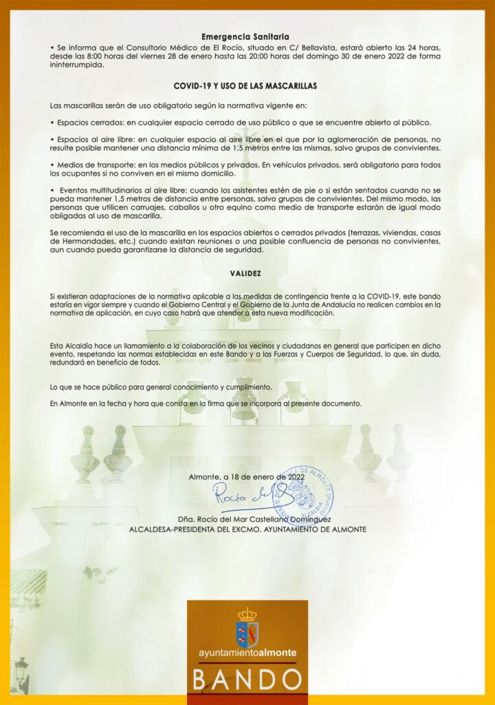 Se informa que el Consultorio Médico de El Rocío, situado en C/ Bellavista, estará abierto las 24 horas, desde las 8:00 horas del viernes 28 de enero hasta las 20:00 horas del domingo 30 de enero 2022 de forma ininterrumpida.
