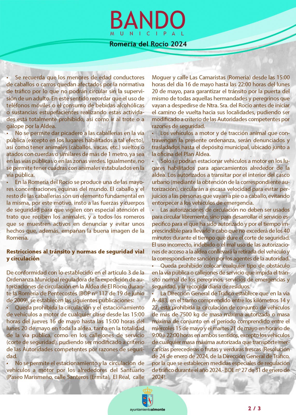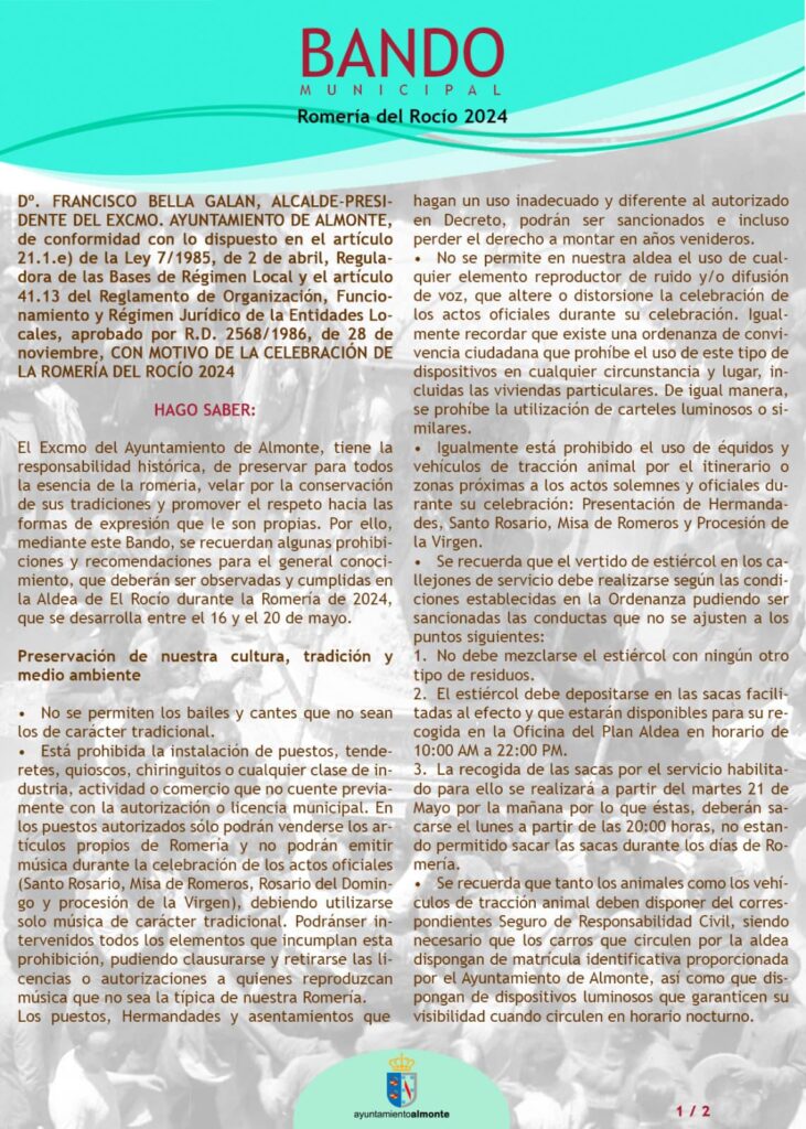 BANDO MUNICIPAL PARA LA ROMERÍA DEL ROCÍO 2024