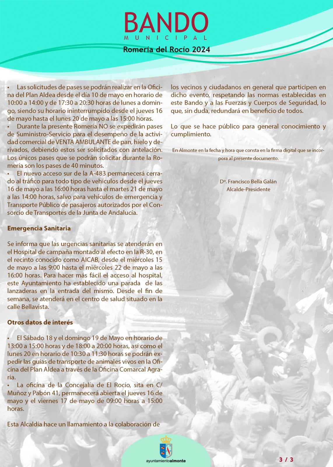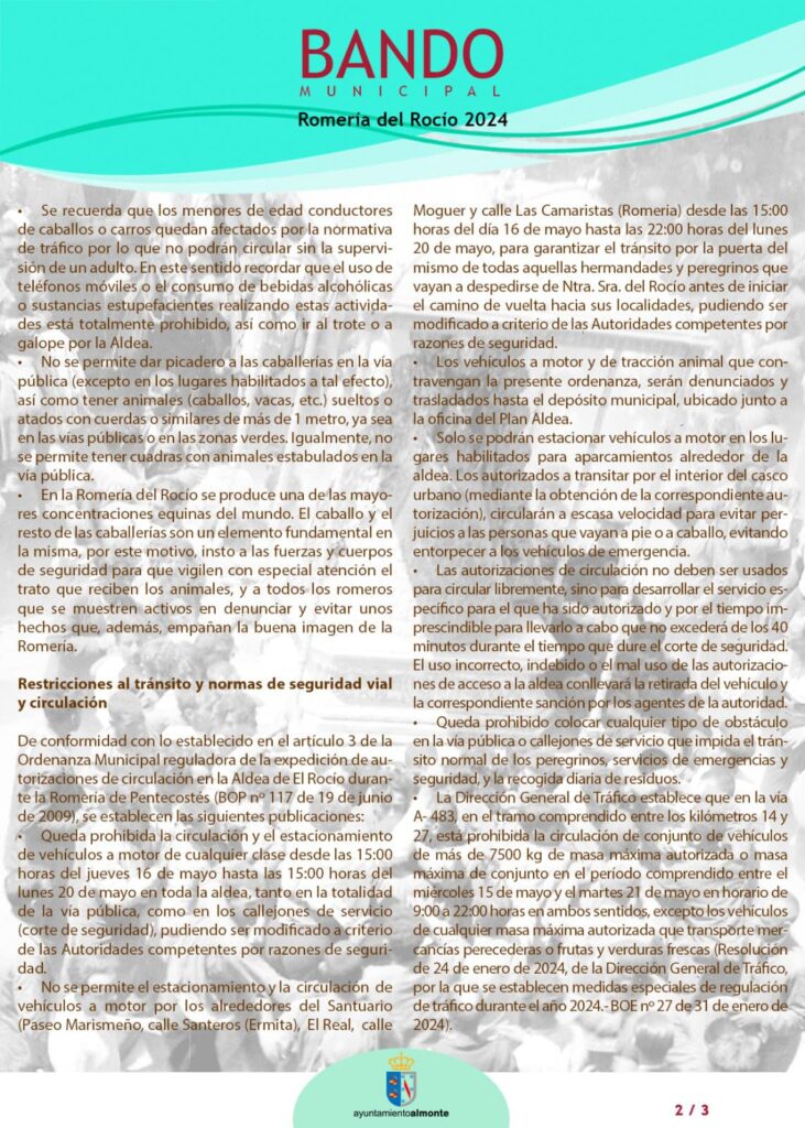 Este es el Bando Municipal en el que se recoge todo lo referente a la seguridad, circulación y vías de evacuación para esta Romería del Rocío 2024.