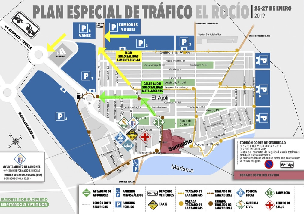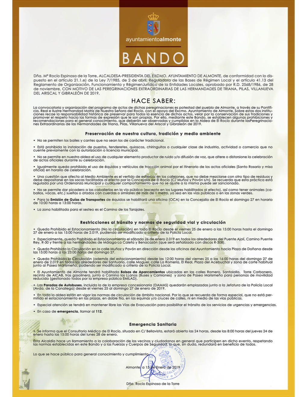 Mediante este Bando, se establecen algunas prohibiciones y recomendaciones para el general conocimiento, que deberán ser observadas y cumplidas en la Aldea de El Rocío durante las Peregrinaciones Extraordinarias de las Hermandades de Triana, Pilas, Villanueva del Ariscal y Gibraleón de 2019.