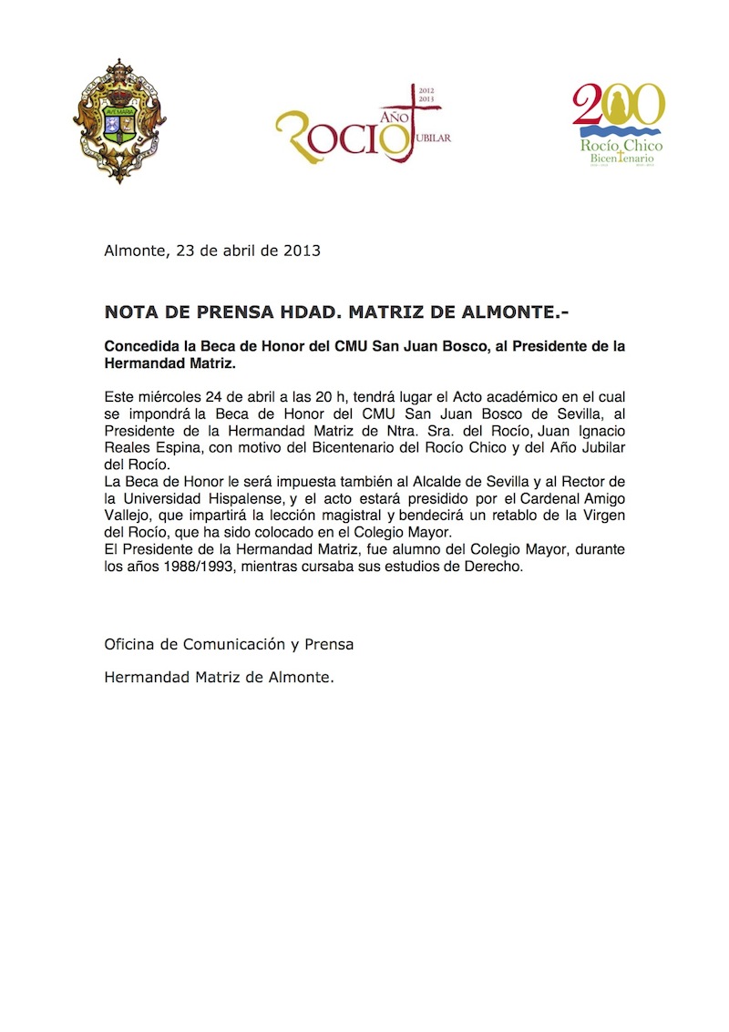 Beca de Honor del CMU San Juan Bosco de Sevilla al Presidente de la Hermandad Matriz