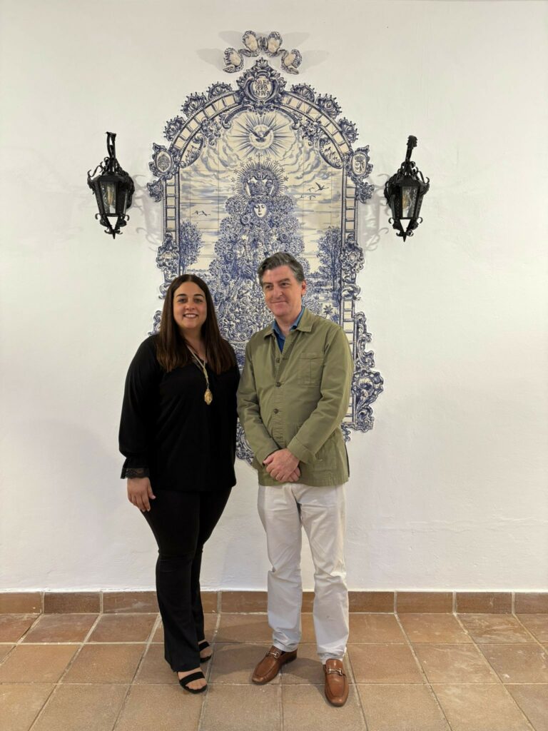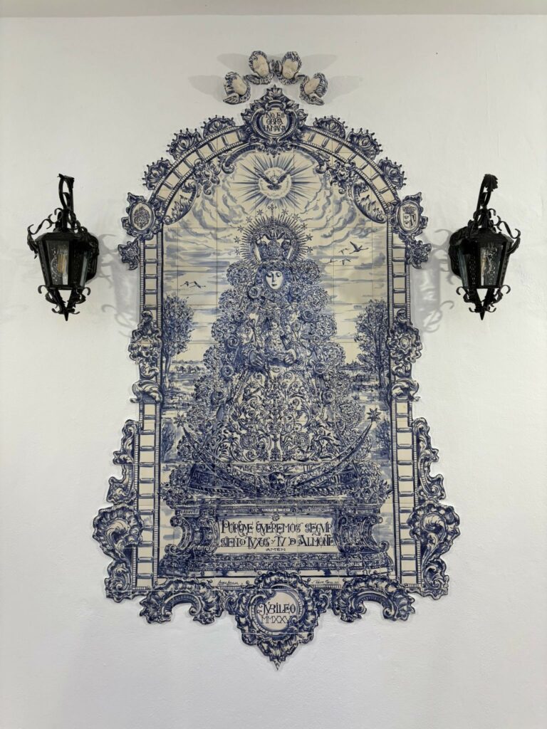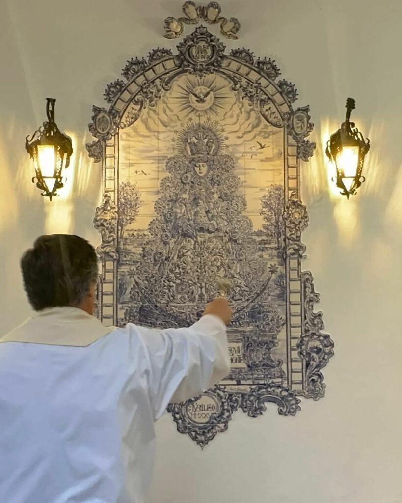 En la tarde de hoy se ha bendecido un azulejo de la Virgen del Rocío en el patio de la Casa de nuestra Hermandad en El Rocío, que lo presidirá en adelante, obra del pintor y ceramista Javier Aguilar.