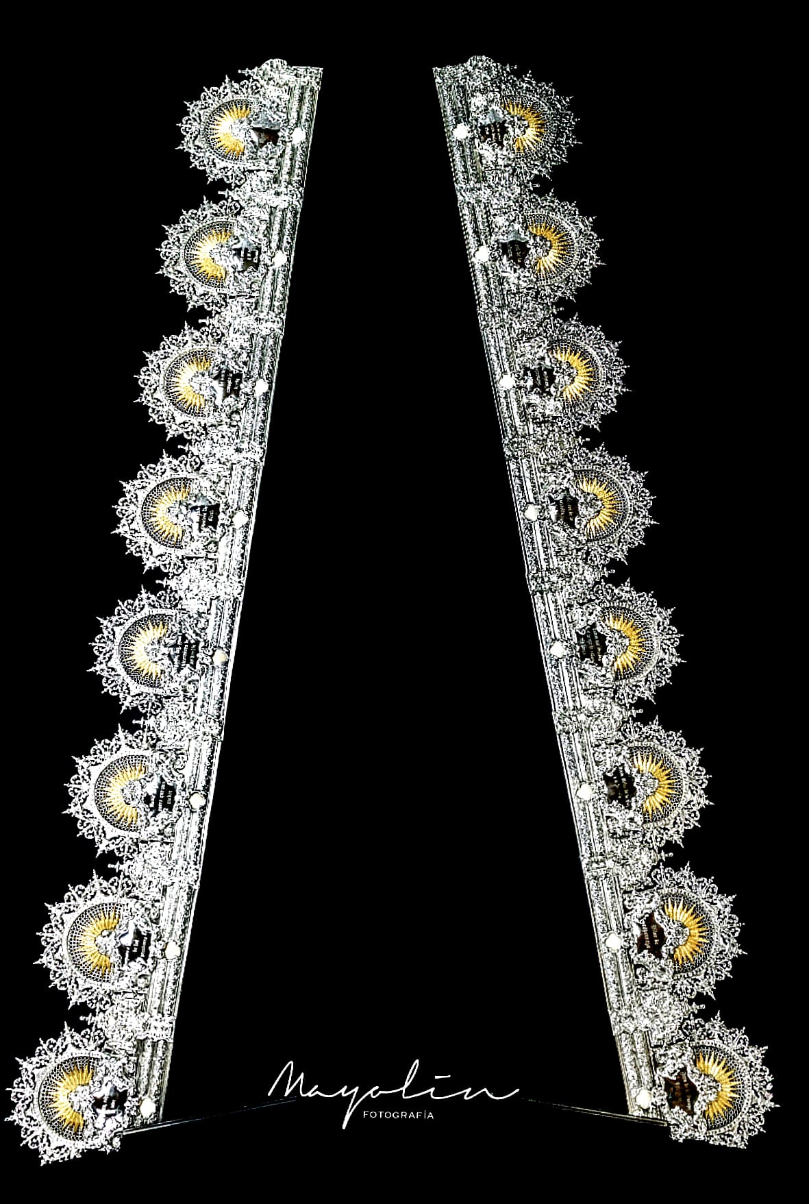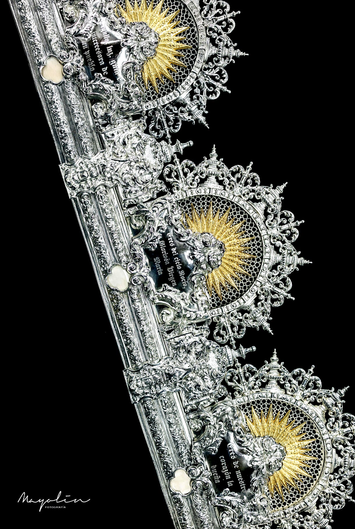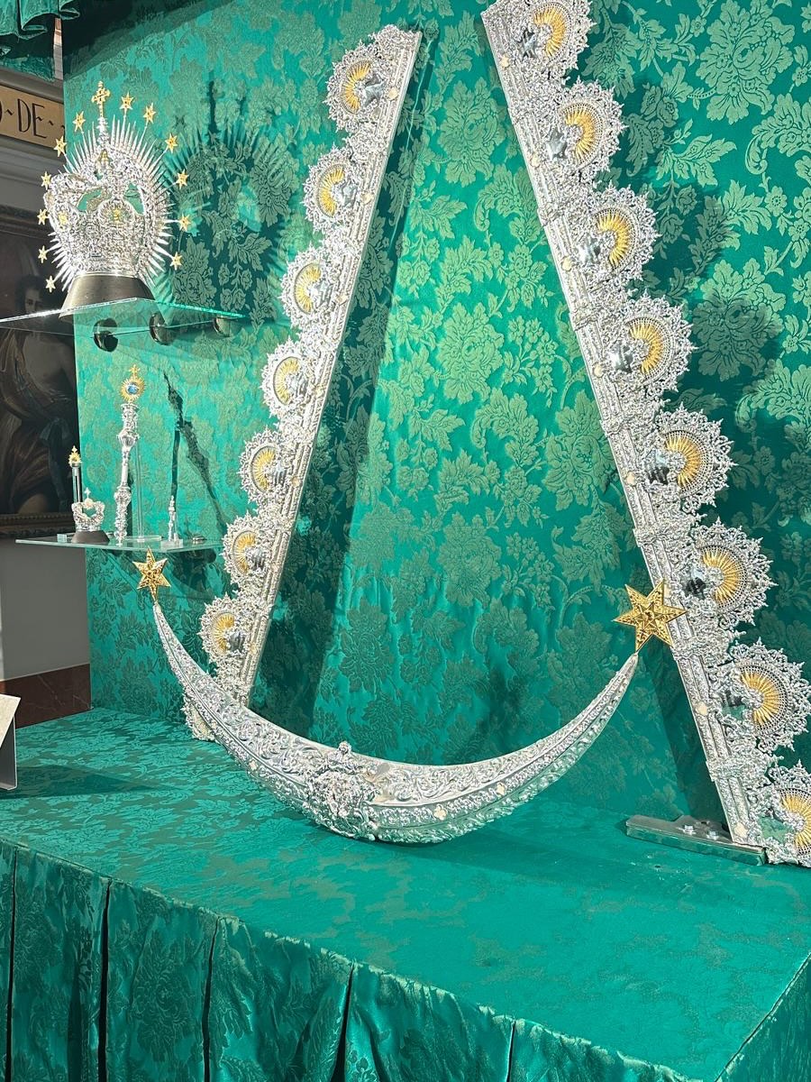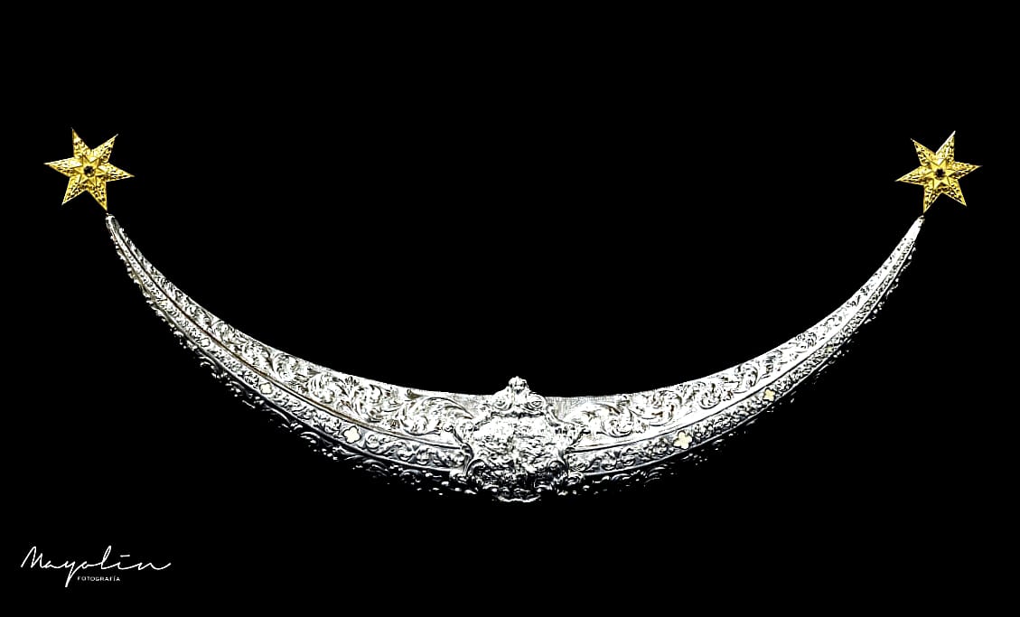 • Media Luna, sufragada por la familia Ojeda-Escobar, realizada en plata de ley, con estrellas sobredoradas enriquecidas con topacios y una cartela central que representa la instauración del Santo Rosario.