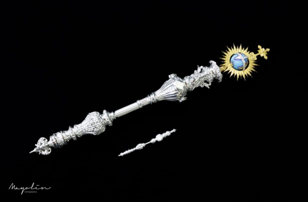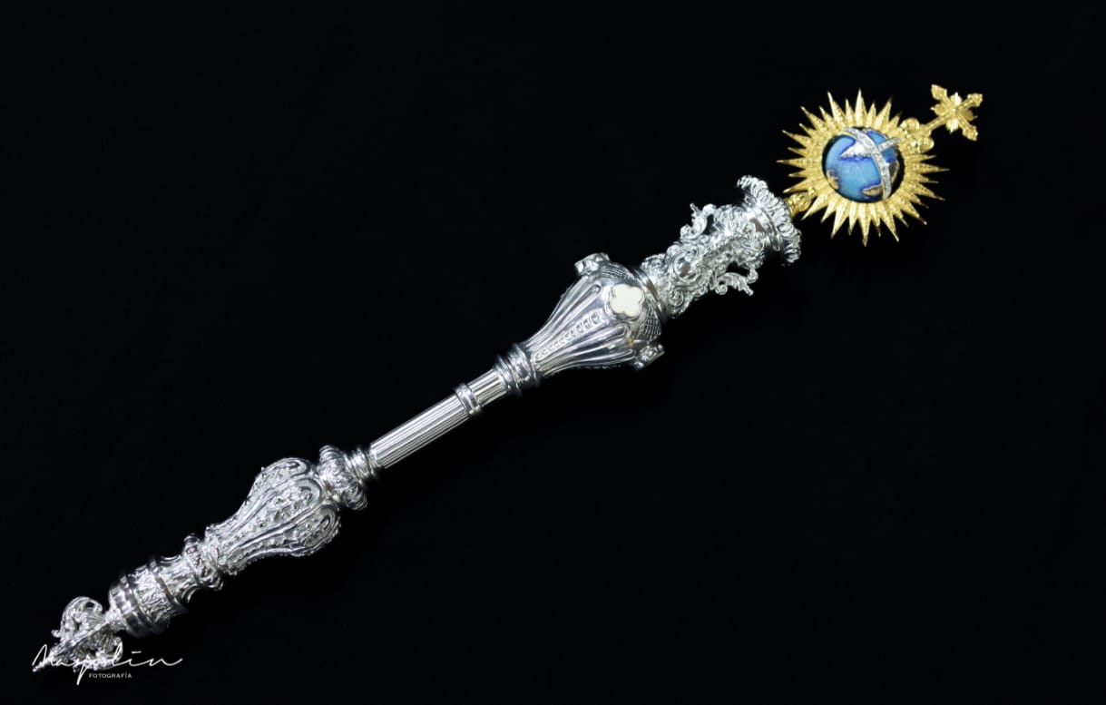 • Cetro de la Virgen ha sido sufragado mediante donaciones anónimas, siguiendo la línea estética del conjunto de orfebrería. Está rematado por una bola terráquea, con el océano en esmalte azul, los continentes en plata y los meridianos y resplandor en plata dorada.