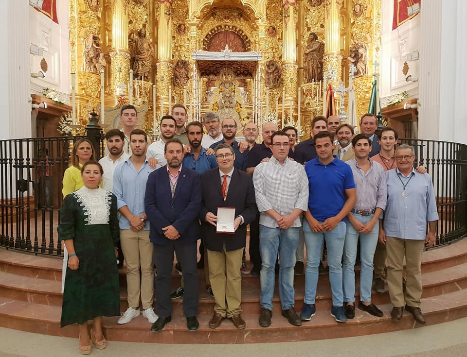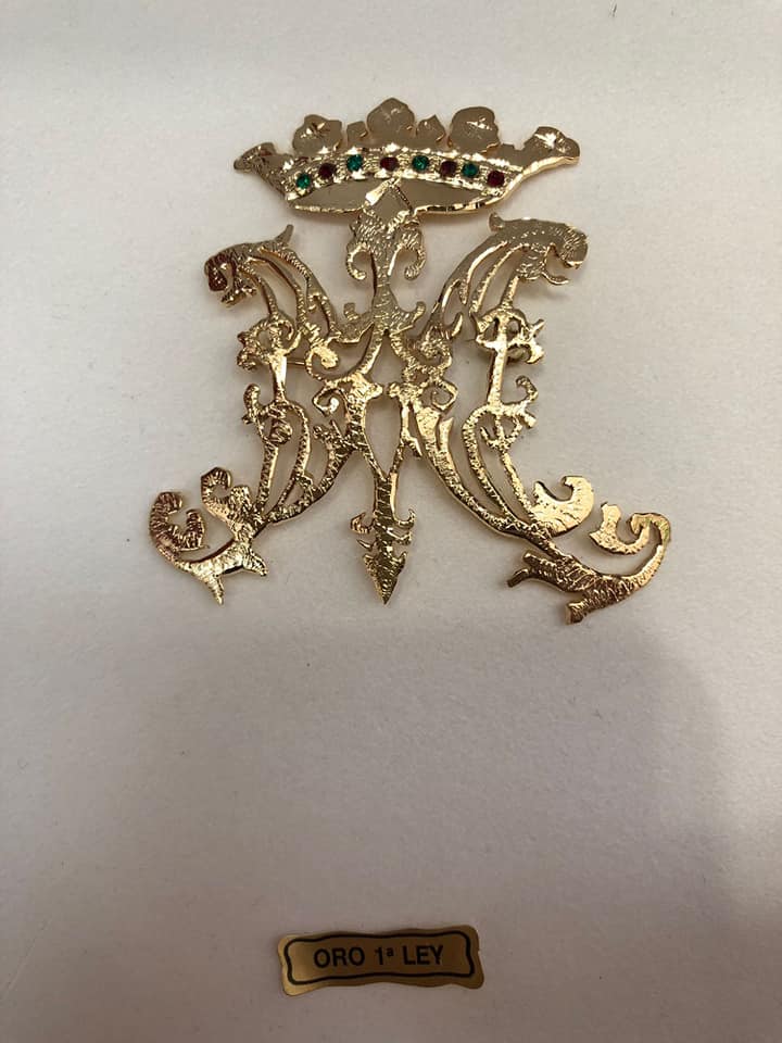 Anoche, después del triduo, un grupo de 12 jóvenes almonteños, hermanos de la Hermandad, hicieron entrega de un broche de oro e incrustación de piedras rojas y verdes, para la Virgen, con la forma del anagrama de María, rematado con la corona real, basado en el anagrama mariano que luce el simpecado de nuestra Hermandad en la parte trasera.