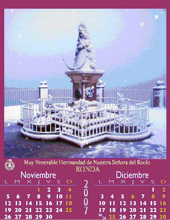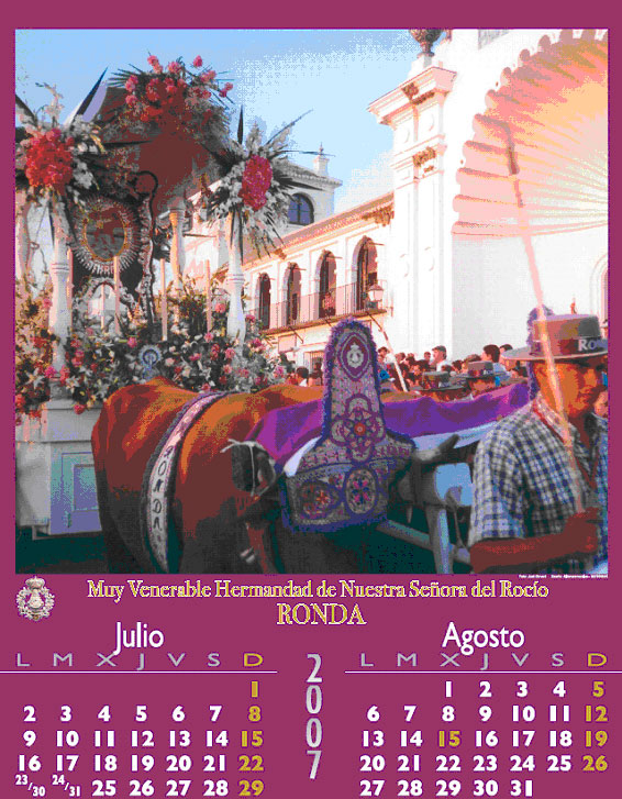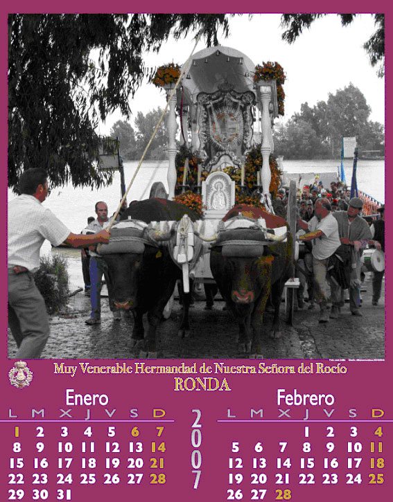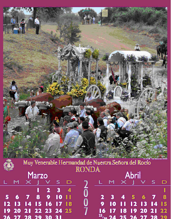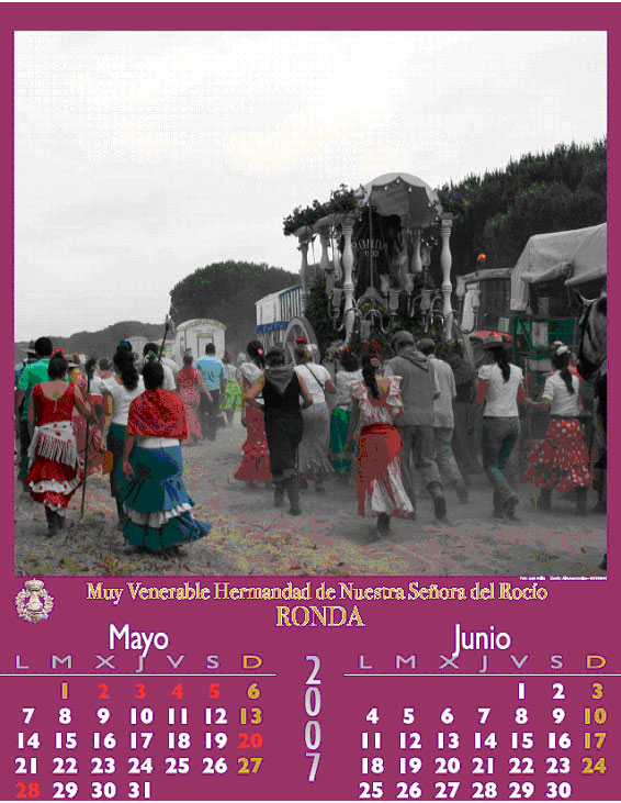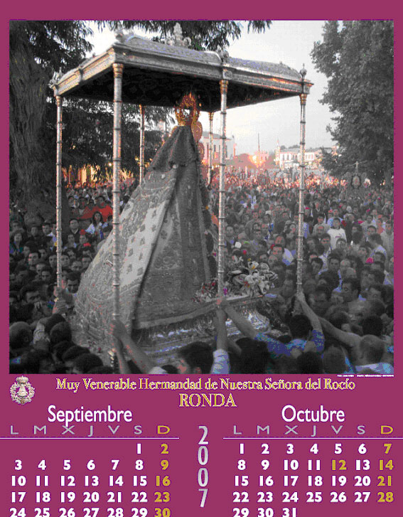 Se ha puesto a la venta al precio de 5 euros el calendario de la Hdad. de Ntra Sra. del Rocío de Ronda. Las fotografías, de una extraordinaria belleza, han sido realizadas por:José Avilés, José Sirvent, Joaquín Rincón Ayala. El cuidado diseño ha estado a cargo de Alfonso Morales.