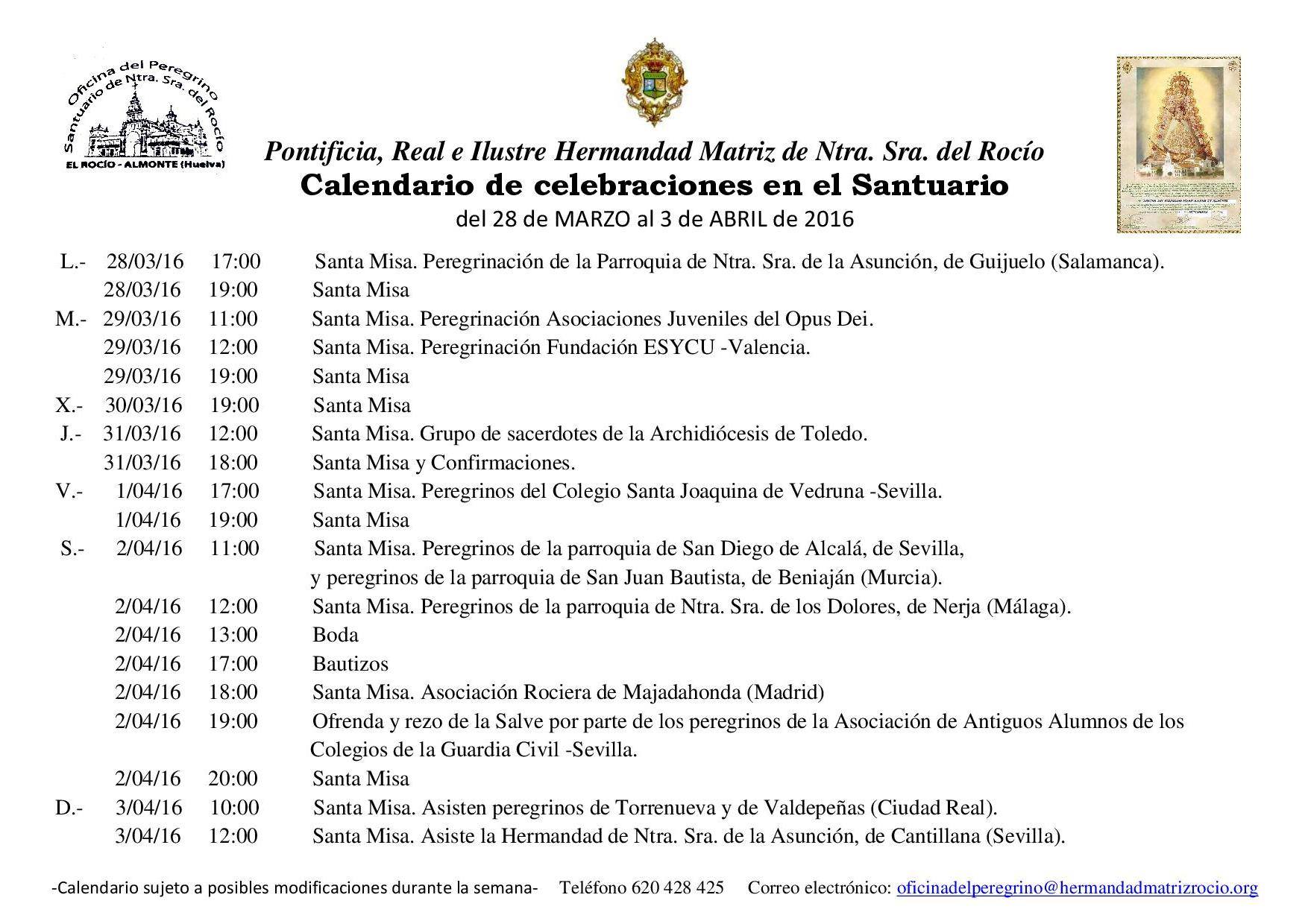 Calendario de Celebraciones en el Santuario del Rocío del 28 de marzo al 3 de abril de 2016