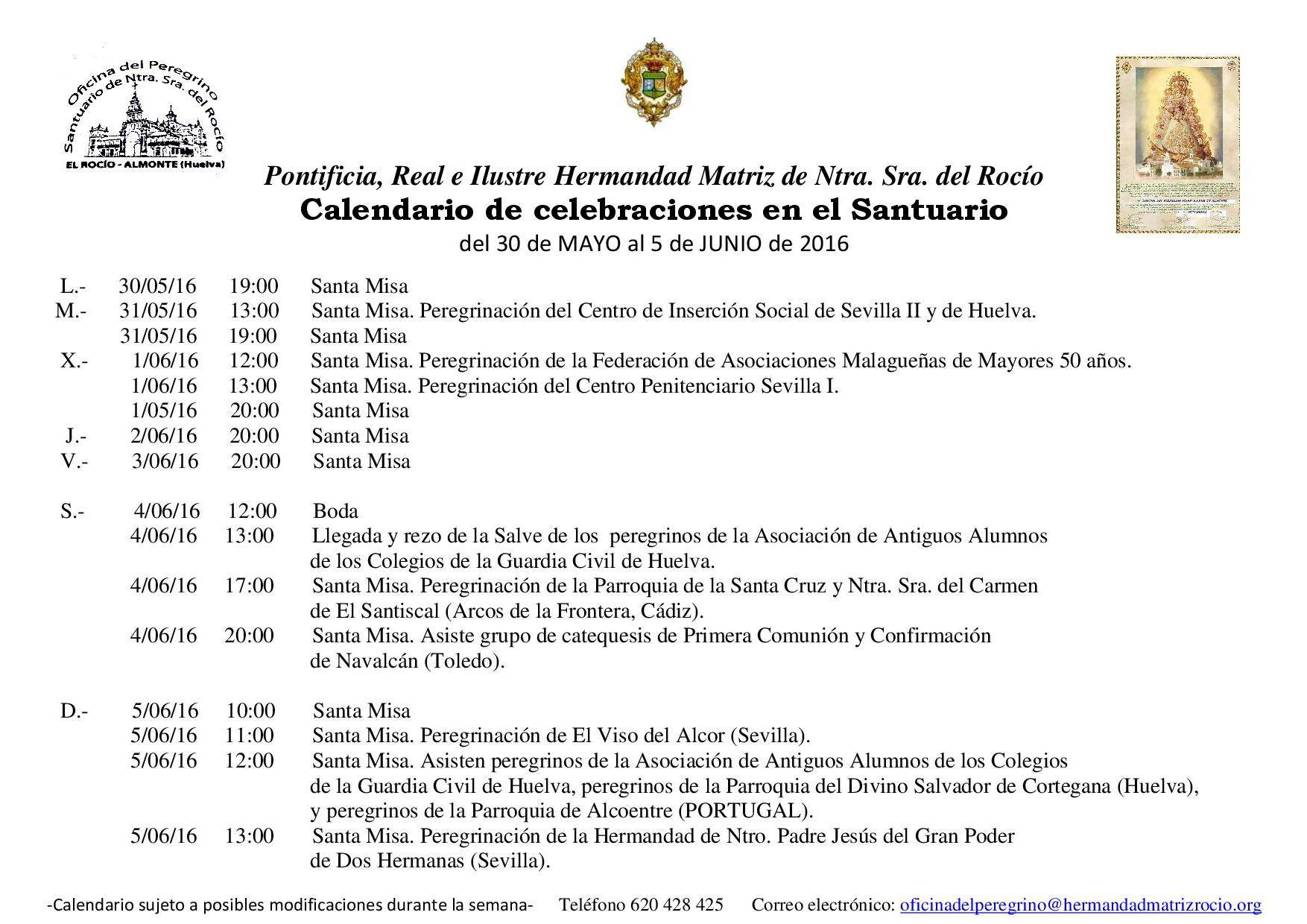 Calendario de Celebraciones en el Santuario de El Rocío de 30 de mayo al 5 de junio de 2016