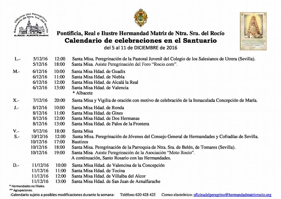 Calendario de Celebraciones en el Santuario de El Rocío del 5 al 11 de diciembre 2016