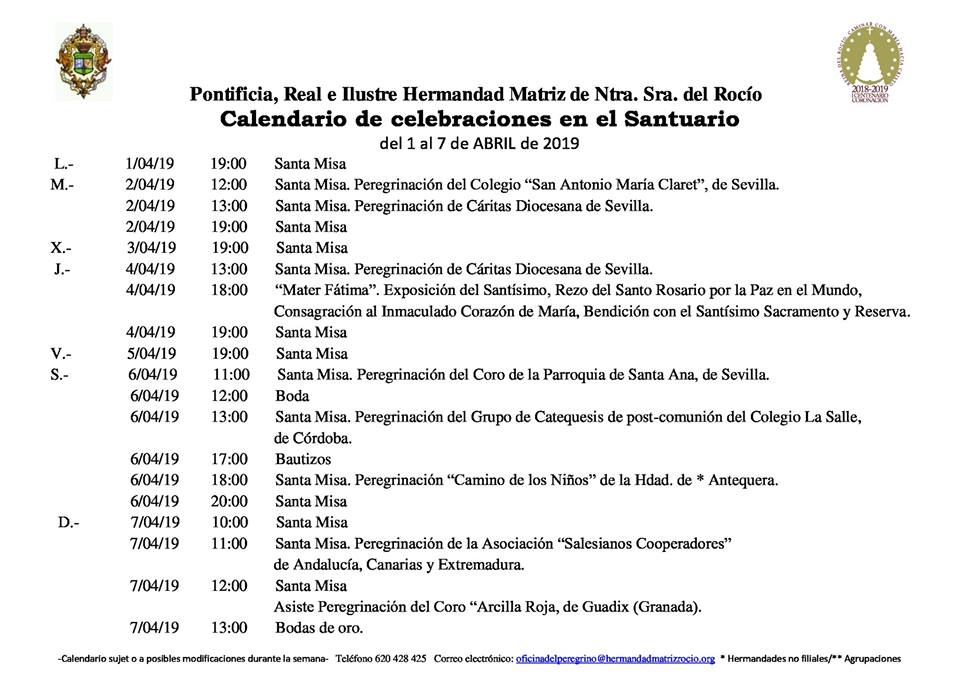 Calendario de Celebraciones en el Santuario del Rocío del 1 al 7 de abril de 2019