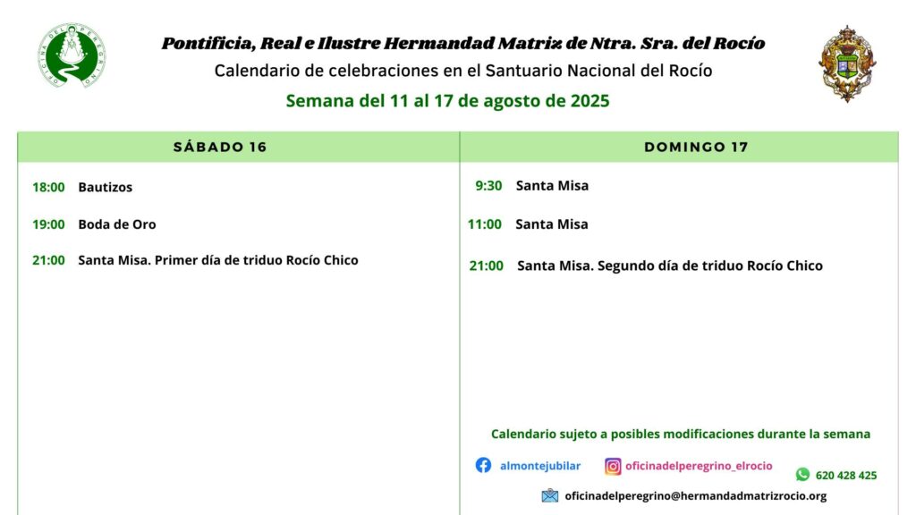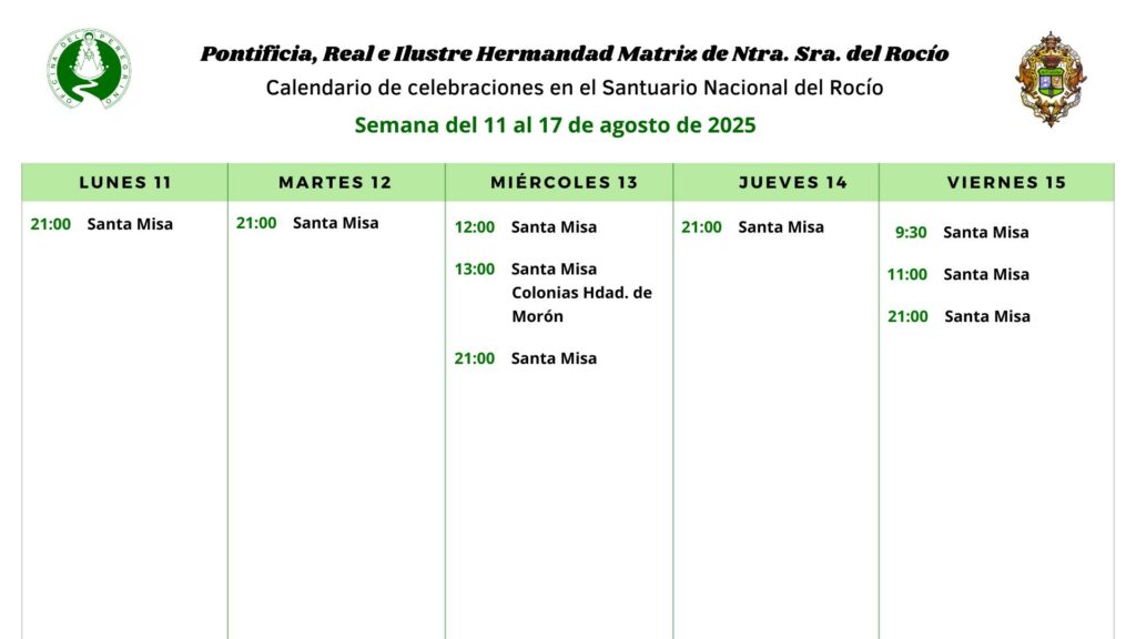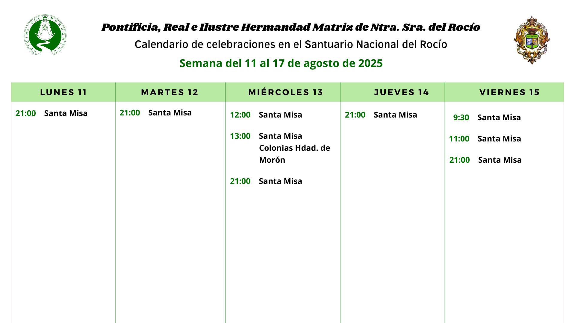 Calendario de Celebraciones en el Santuario del Rocío del 11 a 17 de agosto 2025