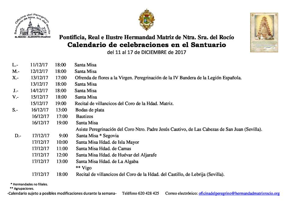 Calendario de Celebraciones en el Santuario del Rocío del 11 al 17 de diciembre de 2017