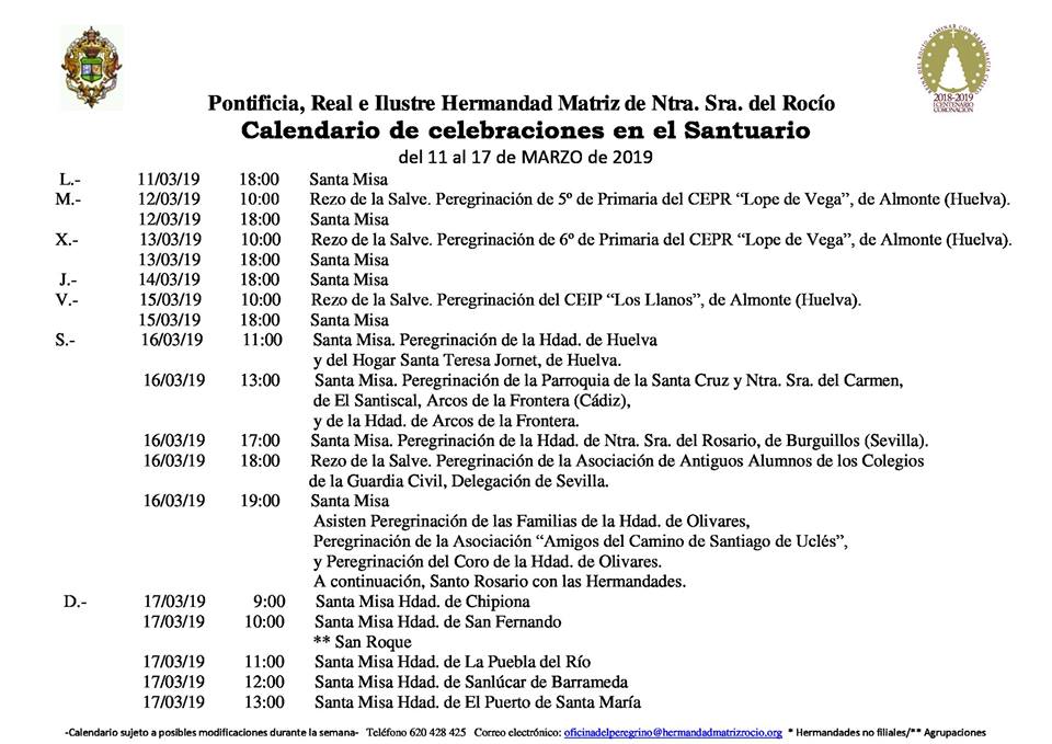 Calendario de Celebraciones en el Santuario del Rocío del 11 al 17 de marzo de 2019