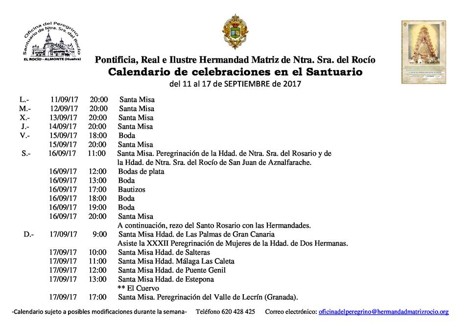 Calendario de Celebraciones en el Santuario del Rocío del 11 al 17 de septiembre de 2017