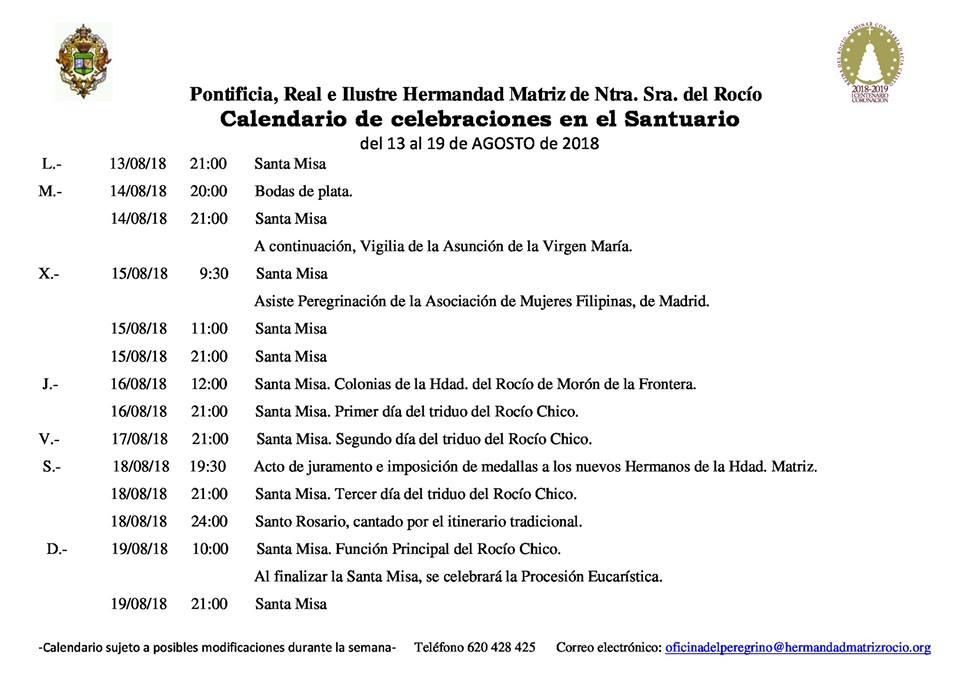Calendario de Celebraciones en el Santuario del Rocío del 13 al 19 de agosto de 2018