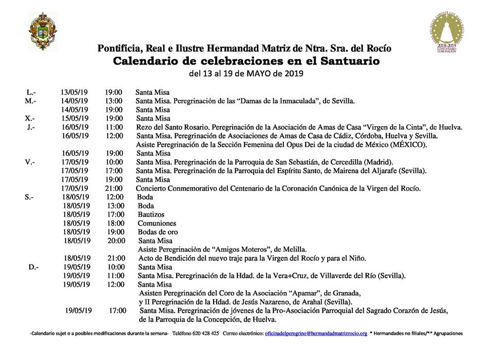 Calendario de Celebraciones en el Santuario del Rocío del 13 al 19 de mayo de 2019.