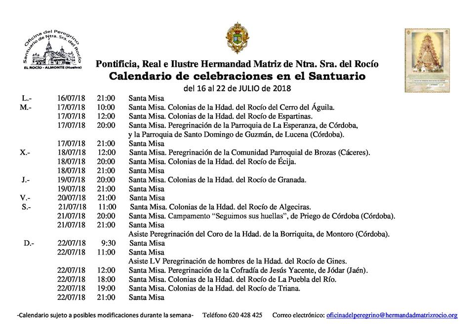 Calendario de Celebraciones en el Santuario del Rocío del 16 al 22 de julio de 2018.