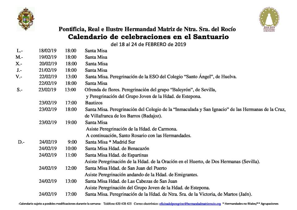 Calendario de Celebraciones en el Santuario del Rocío del 18 al 24 de febrero de 2019