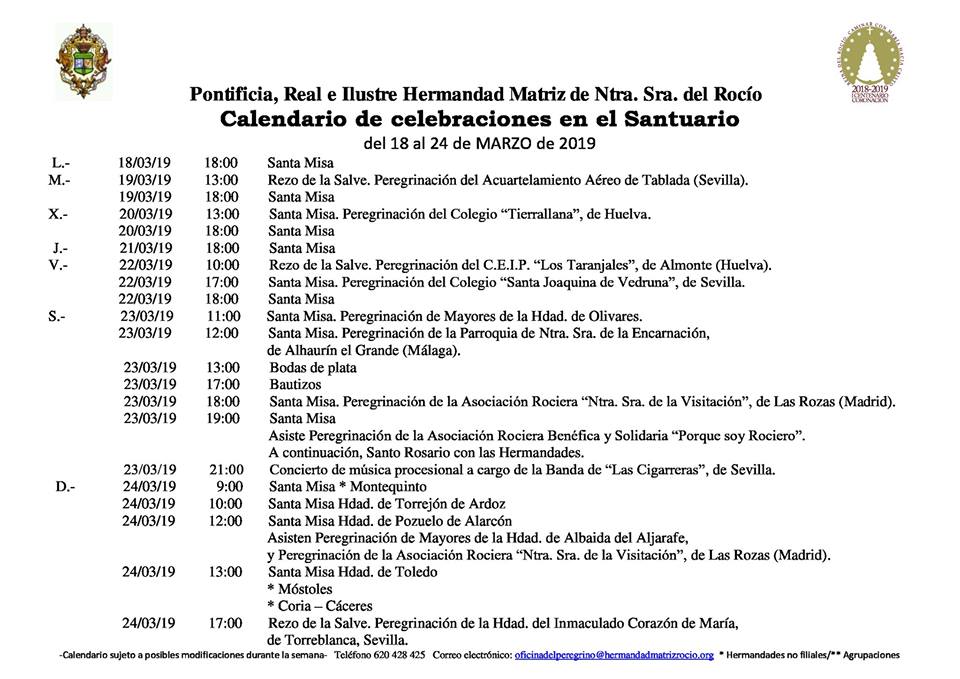 Calendario de Celebraciones en el Santuario del Rocío del 18 al 24 de marzo de 2019