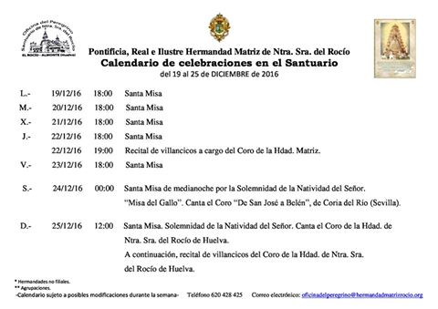 Calendario de Celebraciones en el Santuario del Rocio del 19 al 25 de diciembre 2016