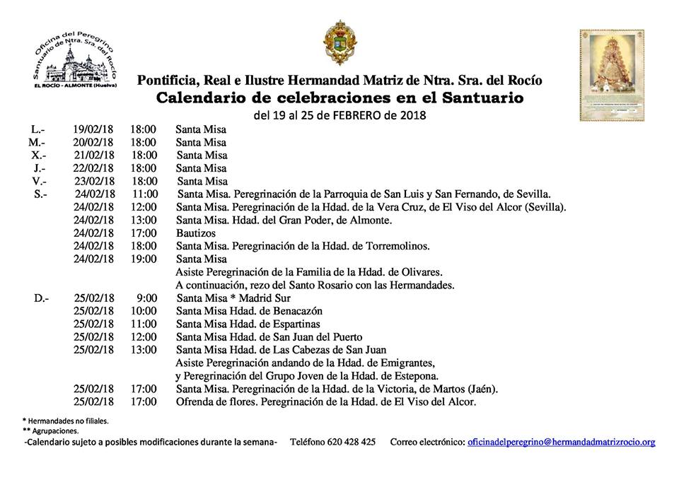 Calendario de Celebraciones en el Santuario del Rocío del 19 al 25 de febrero de 2018