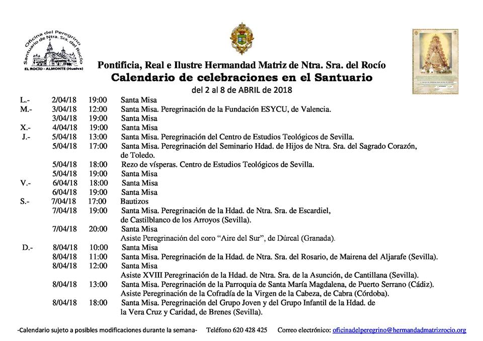 Calendario de Celebraciones en el Santuario del Rocío del 2 al 8 de abril de 2018
