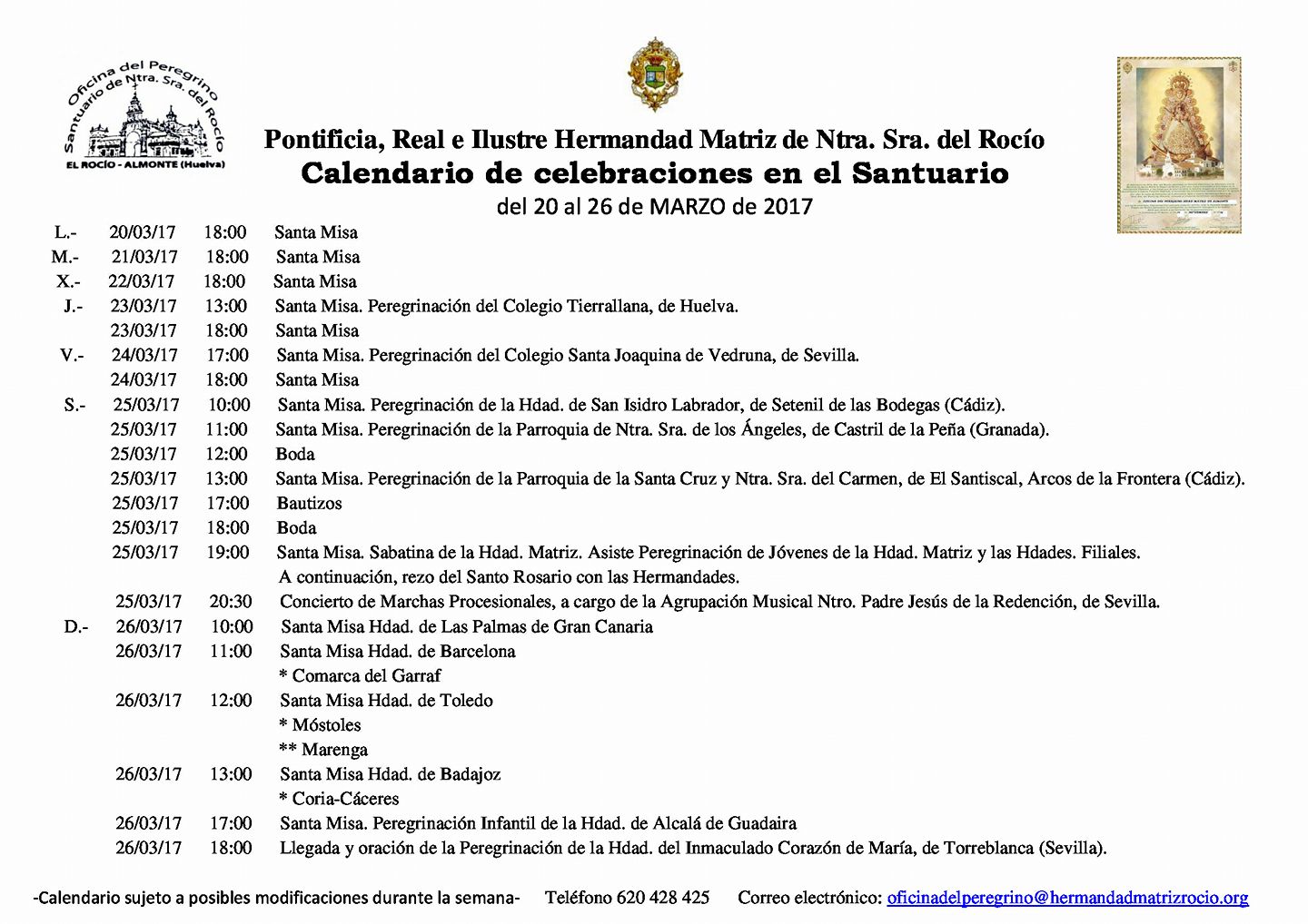 Calendario de Celebraciones en el Santuario del Rocío del 20 al 26 de marzo de 2017