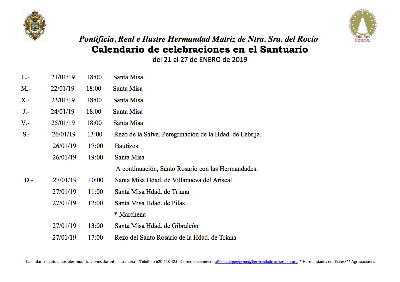 Calendario de Celebraciones en el Santuario del Rocío del 21 al 27 de enero de 2019