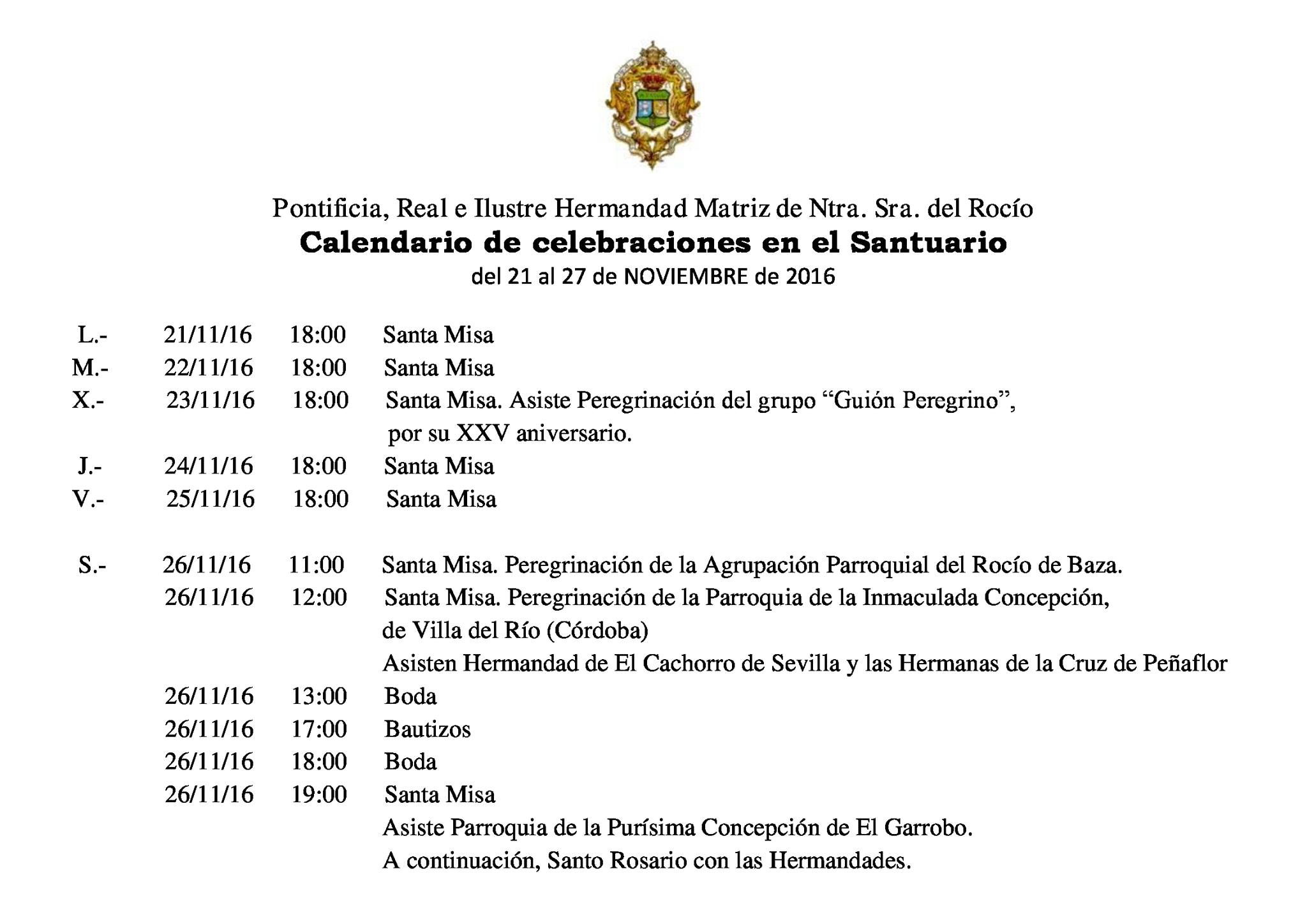 Calendario de Celebraciones en el Santuario del Rocío del 21 al 27 de noviembre de 2016