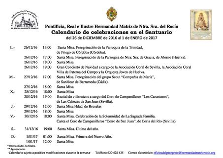 Calendario de Celebraciones en el Santuario del Rocío del 26 de diciembre al 1 de enero de 2017