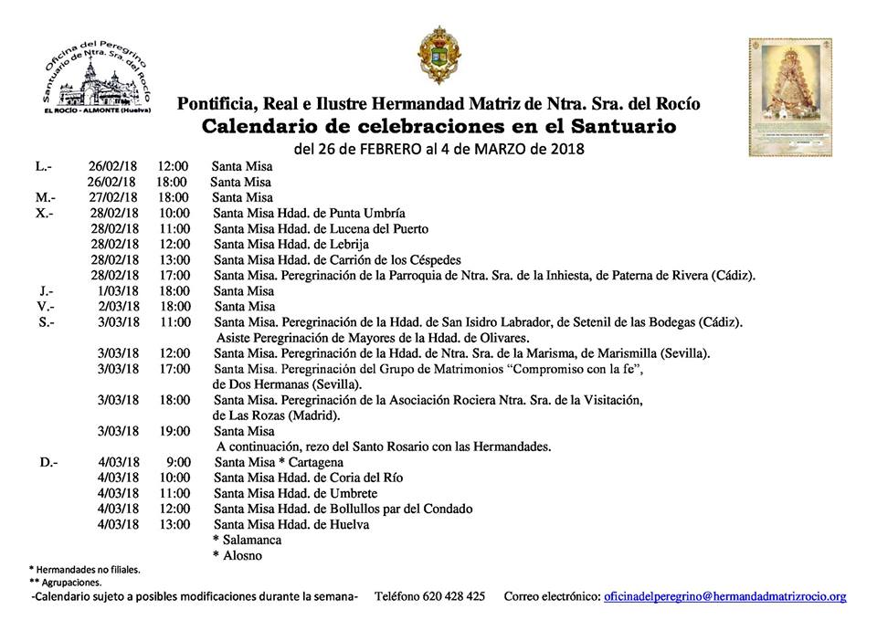 Calendario de Celebraciones en el Santuario del Rocío del 26 de febrero al 4 de marzo de 2018