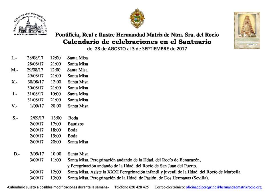 Calendario de Celebraciones en el Santuario del Rocío del 28 de agosto al 3 de septiembre de 2017