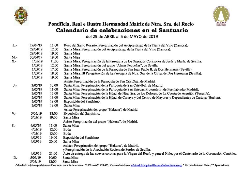 Calendario de Celebraciones en el Santuario del Rocío del 29 de abril al 5 de mayo de 2019