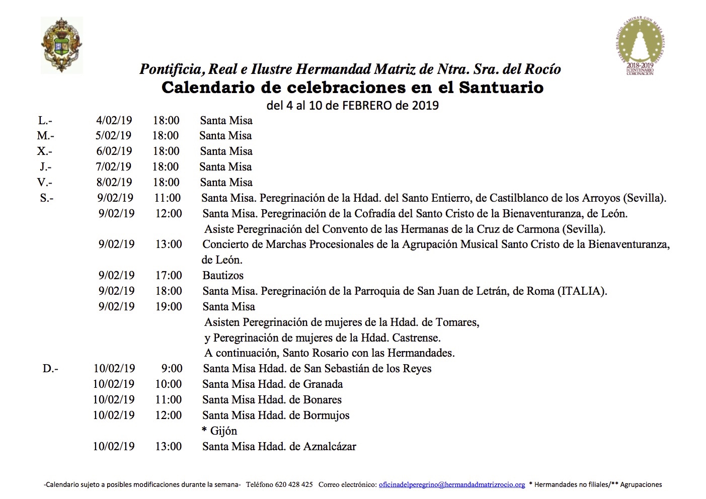 Calendario de Celebraciones en el Santuario del Rocío del 4 al 10 de febrero de 2019