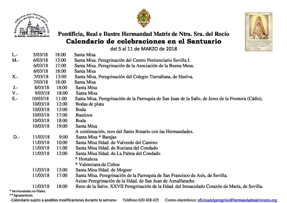 Calendario de Celebraciones en el Santuario del Rocio del 4 al 11 de marzo de 2018
