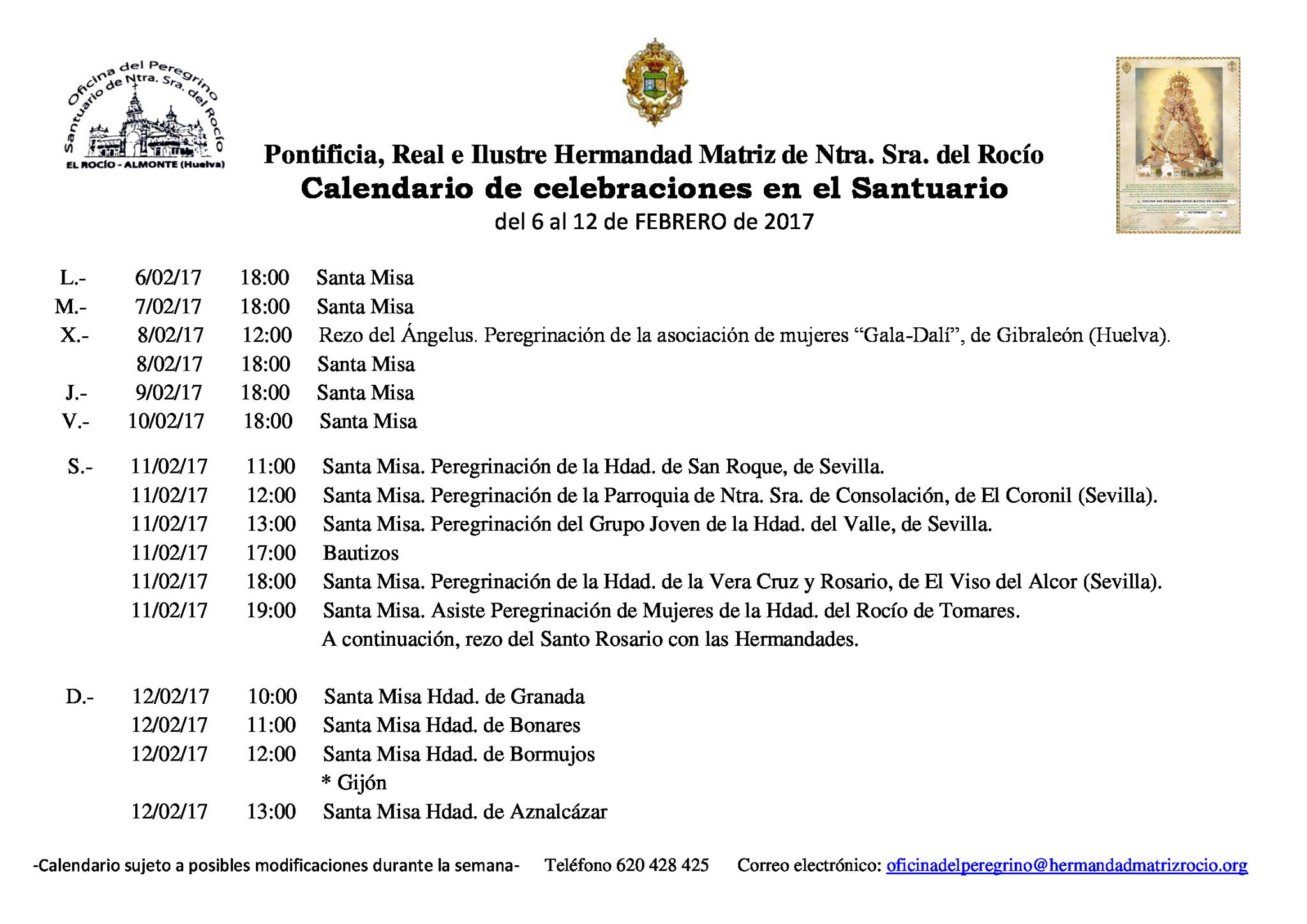 Calendario de Celebraciones en el Santuario del Rocío del 6 al 12 de febrero de 2017