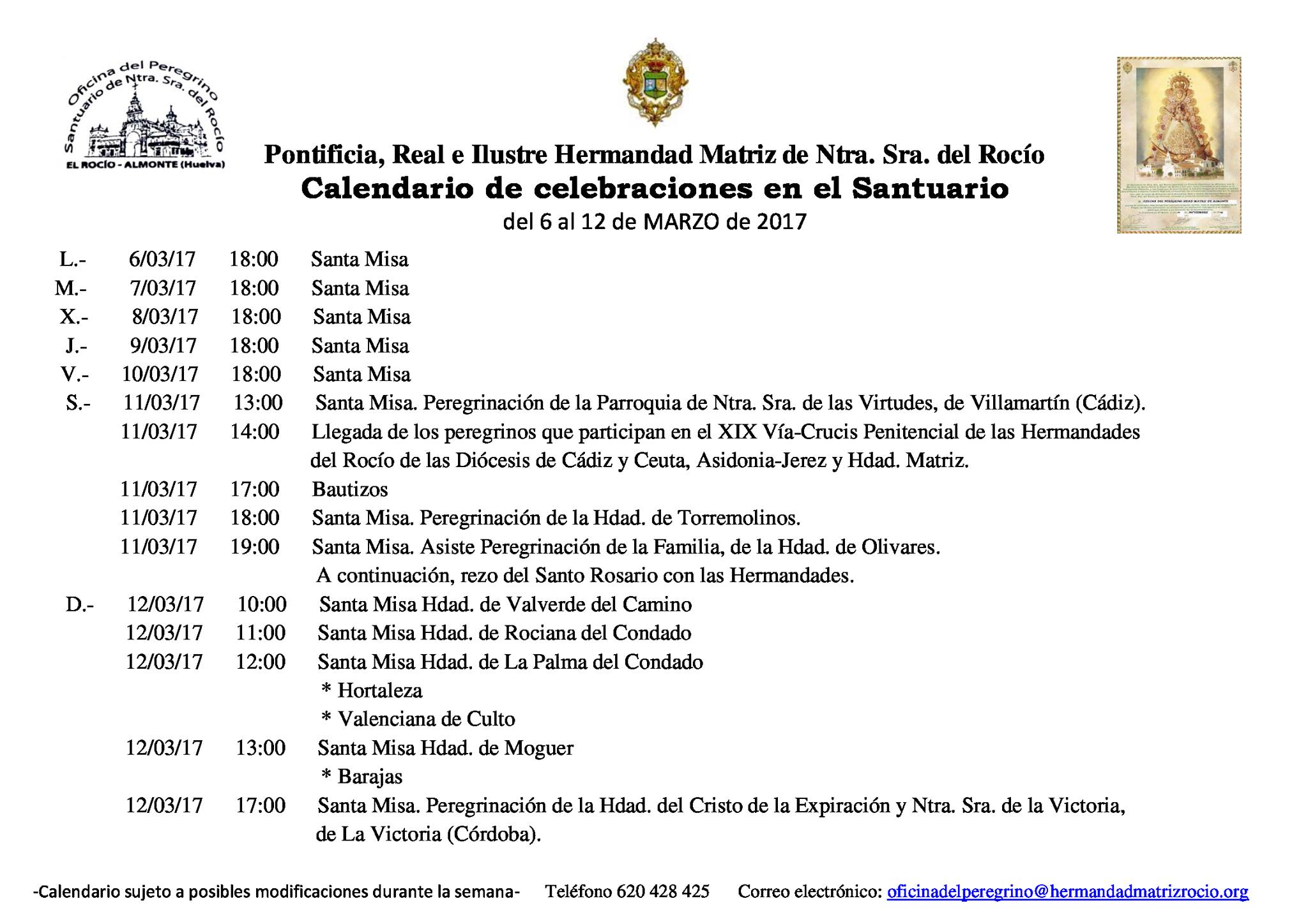 Calendario de Celebraciones en el Santuario del Rocío del 6 al 12 de marzo de 2017